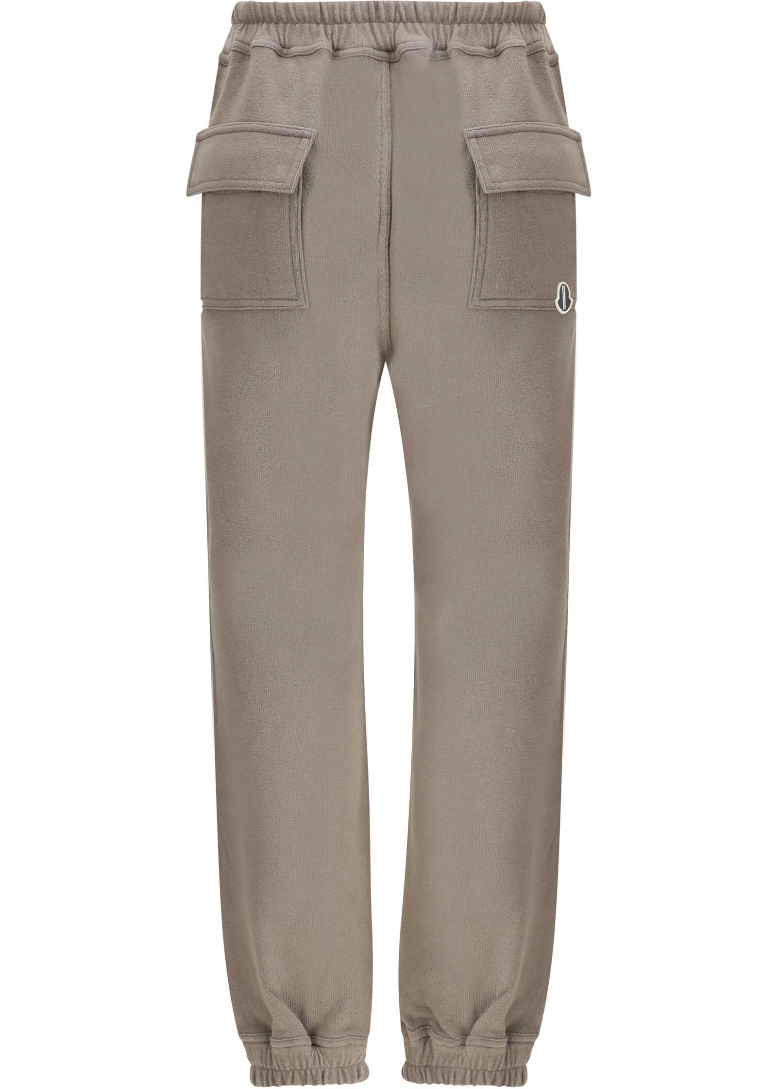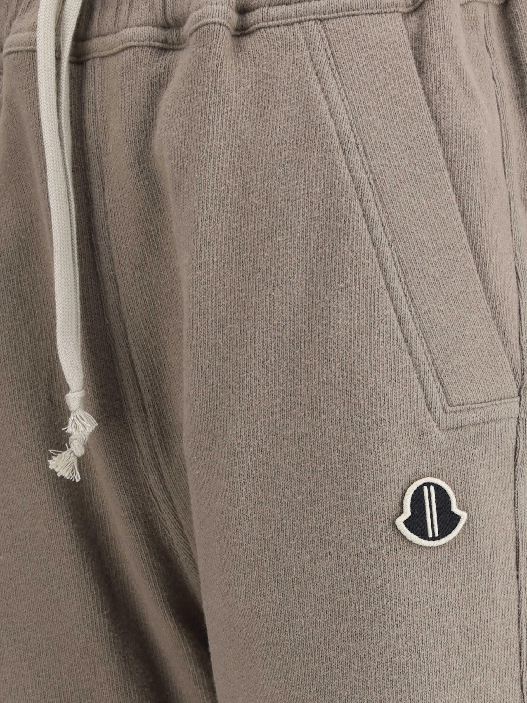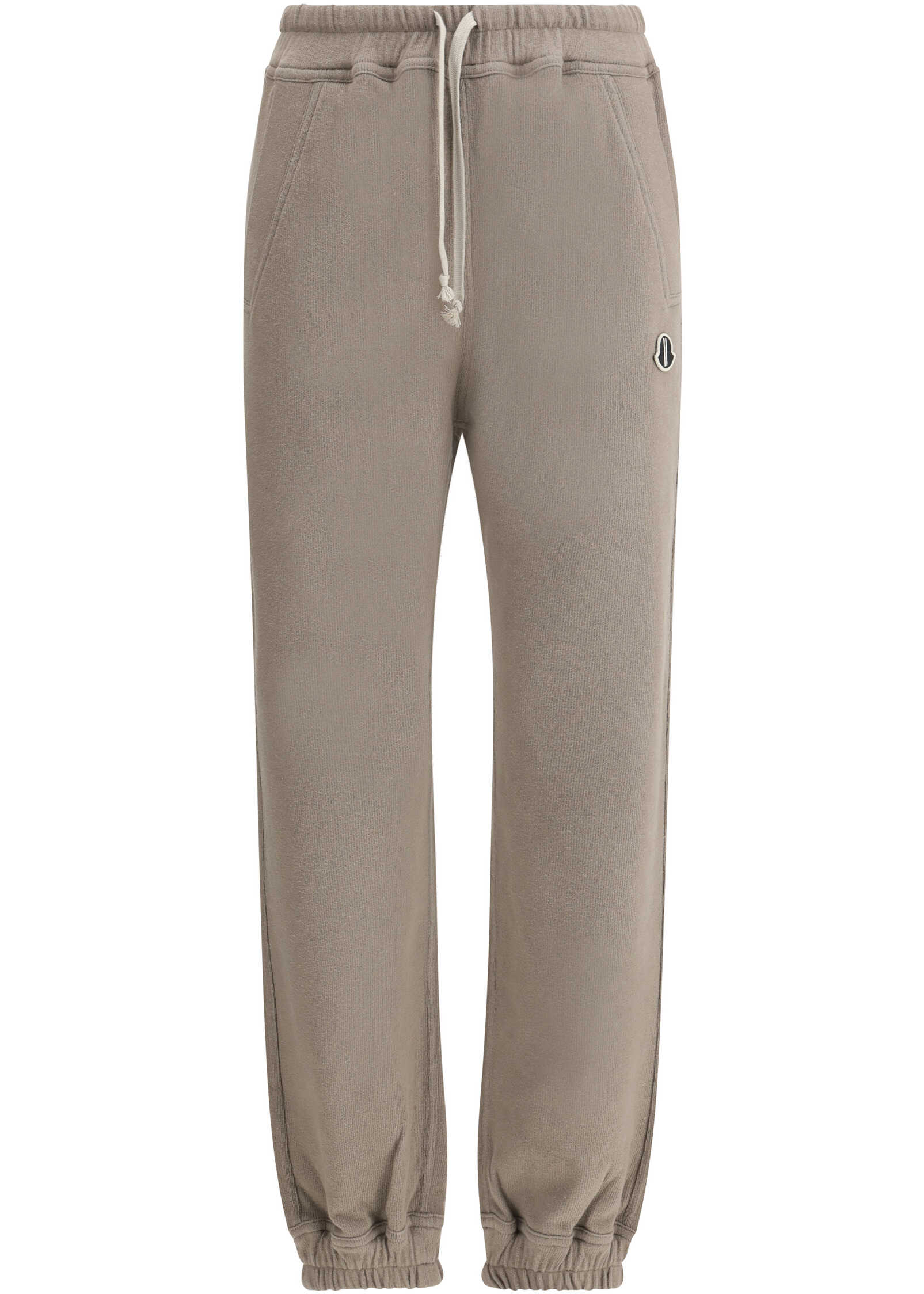 Cotton Sweatpants by Moncler + Rick Owens, jogger style, elasticated waistband with drawstring, two side welt pockets, plush interior, iconic brand logo patch applied on left sleeve, two flap pockets applied on back.