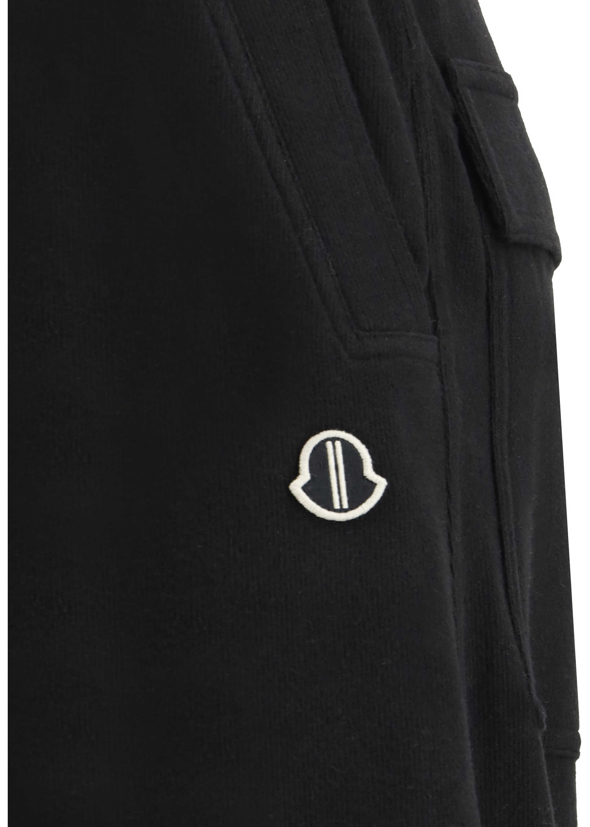 Cotton Belas Pants by Moncler + Rick Owens, wide-leg style, elasticated waistband with drawstring, two side welt pockets, two flap patch pockets on back, plush interior, brand's iconic logo patch applied on left sleeve, monochrome pattern, regular fit.