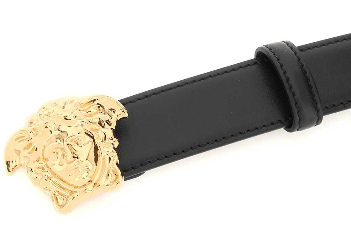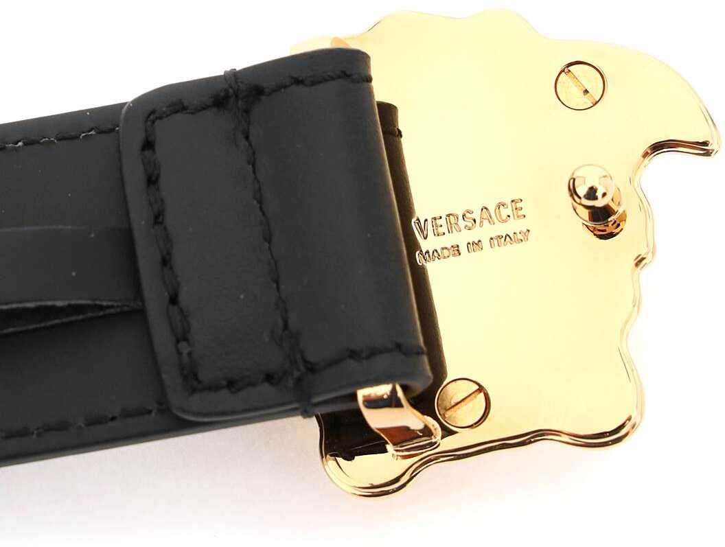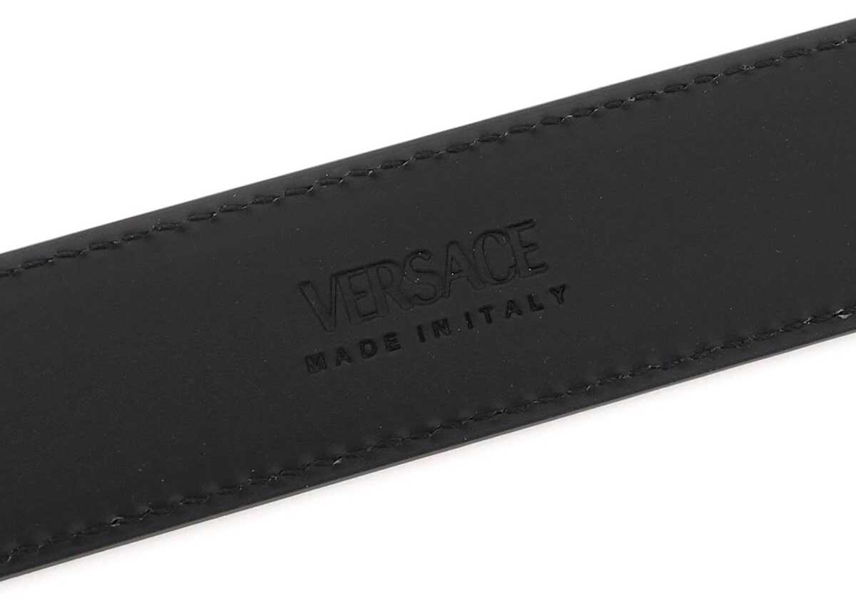 Versace belt crafted in smooth leather with Medusa pin buckle in gold-finished metal. Smooth leather lining. The item in the picture is a size 100.