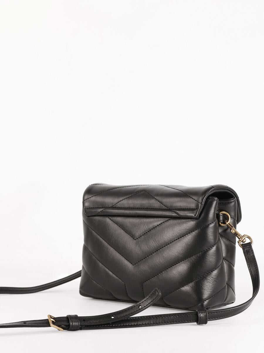 LouLou Toy crossbody bag in black quilted calfskin with gold-tone metal YSL monogram on the front. It features adjustable and detachable shoulder strap, front flap with snap-button fastening, two main interior compartments, one interior zip pocket and three interior card slots. Any leather imperfections are not to be considered manufacturing defects, but a peculiarity of the material.