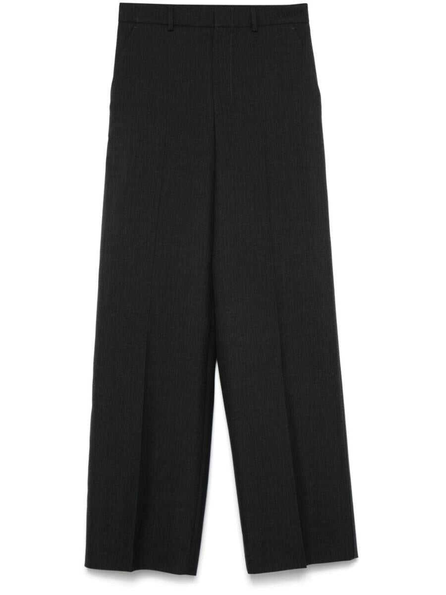 dark grey wool gabardine weave concealed front fastening high waist belt loops embroidered logo to the side pressed crease two side slash pockets two rear jetted pockets tailored cut wide leg