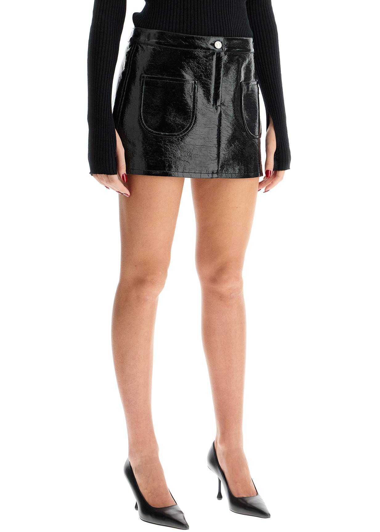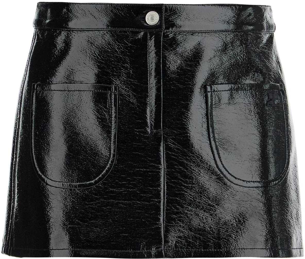 The Courreges miniskirt is made of vinyl and features two front flap pockets, one of which is decorated with an embroidered AC logo. It has a hidden zip closure and button. The model is 177 cm tall and wears a size FR 36.