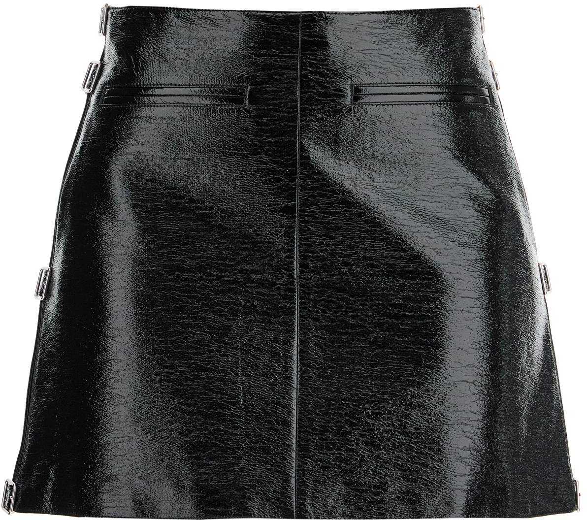 The Courreges miniskirt is made of vinyl and features side buckles that create a cut-out effect, as well as two welt pockets on the front. The model is 177 cm tall and wears size FR 36.