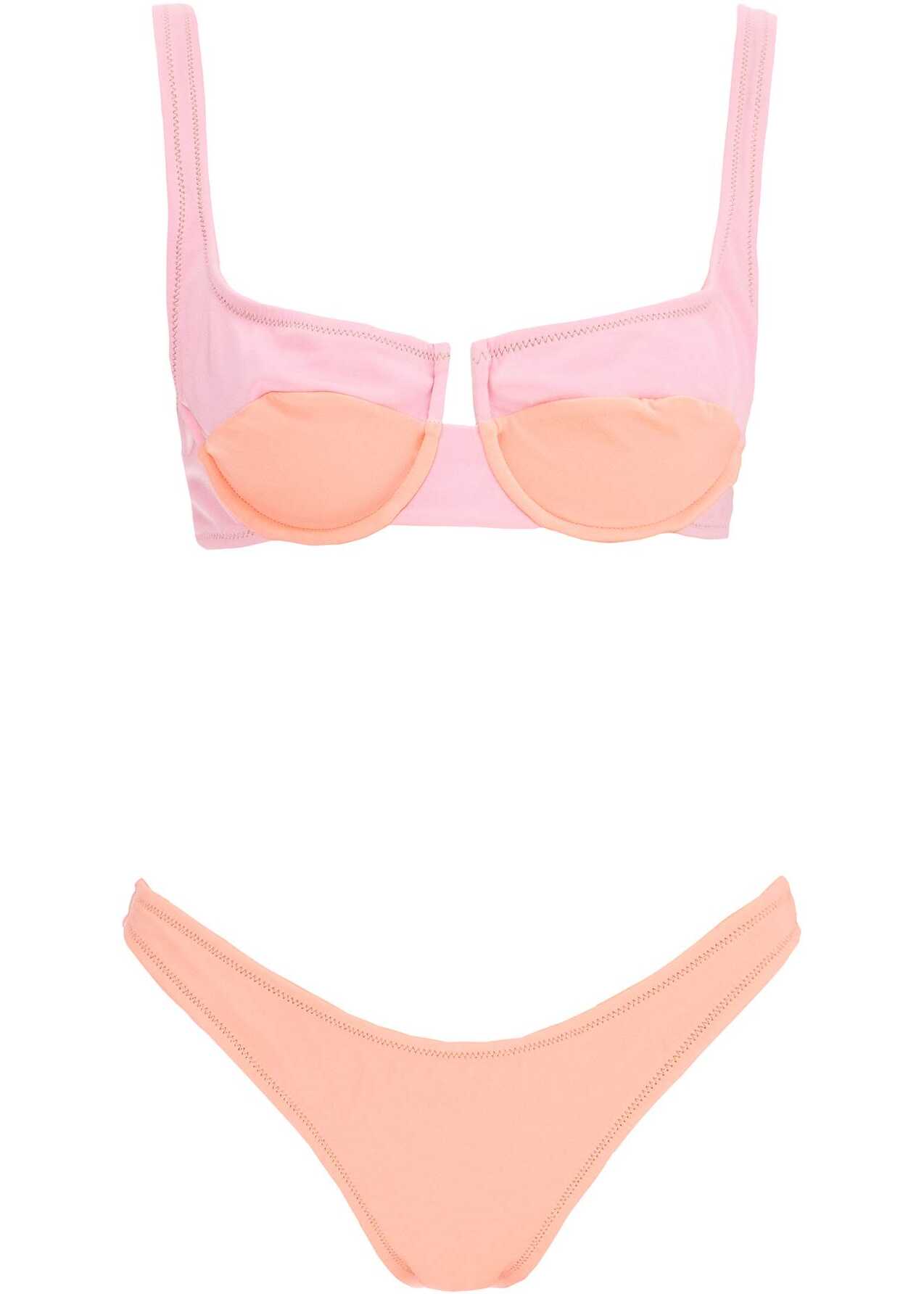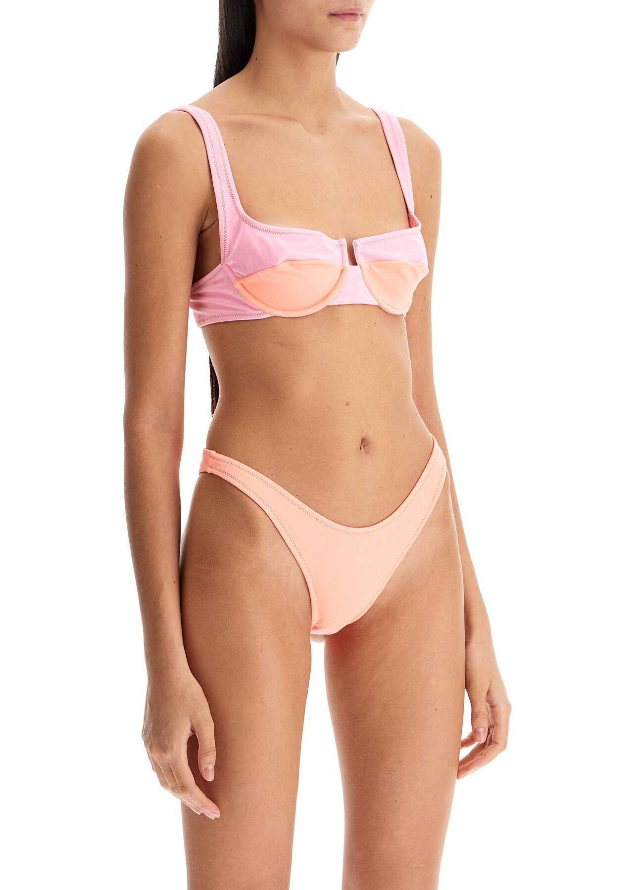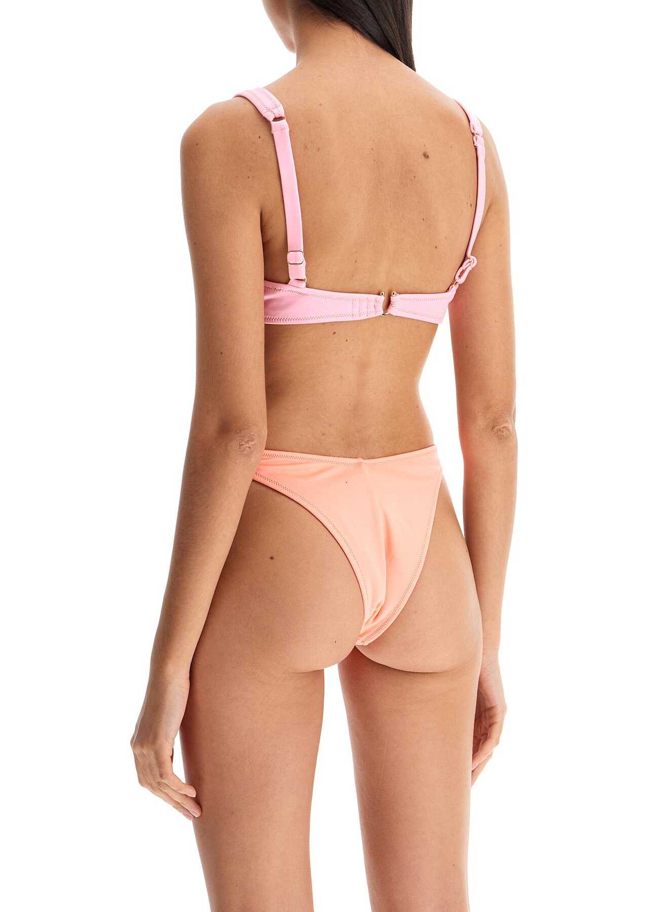 The Brigitte bikini set by Reina Olga is made of stretchy lycra and consists of a low-rise brief and a two-tone underwired bra with non-padded cups and adjustable straps. The back closure features an adjustable horseshoe hook in four positions. The model is 177 cm tall and wears size 1.
