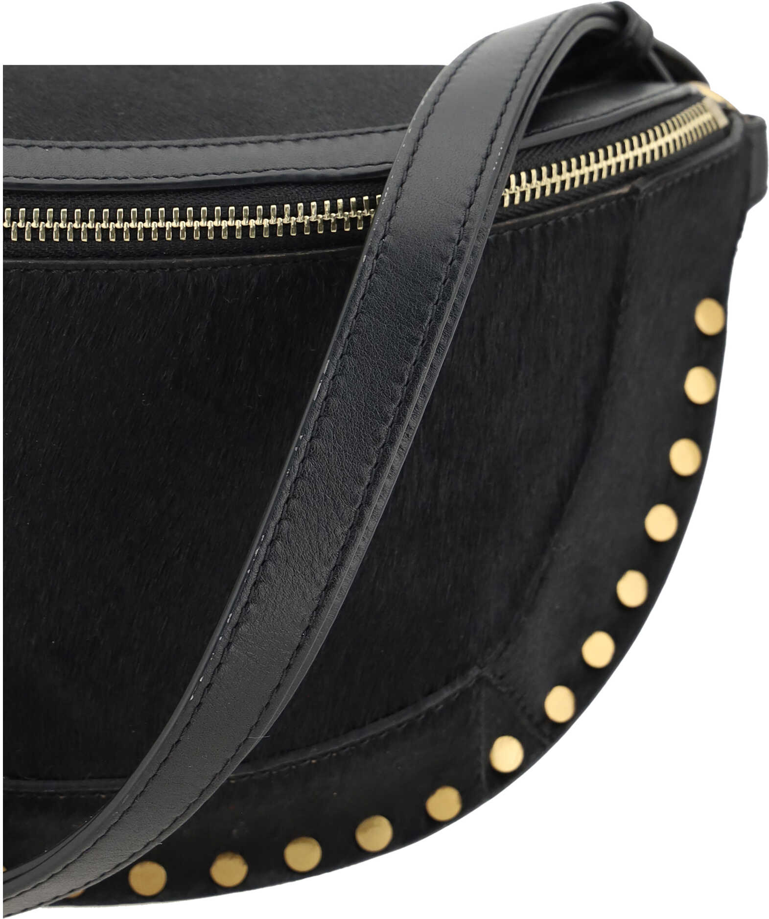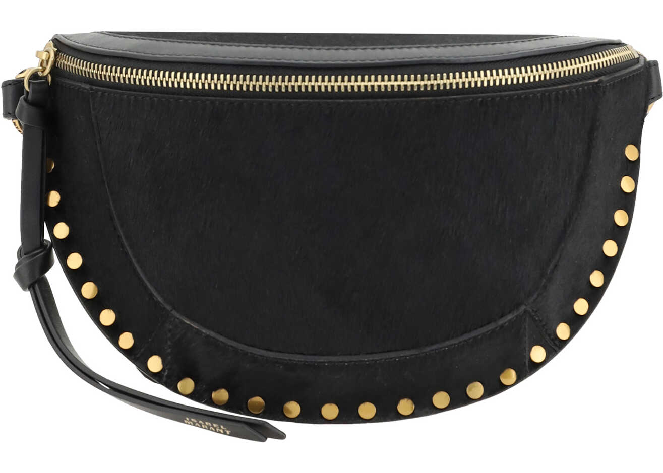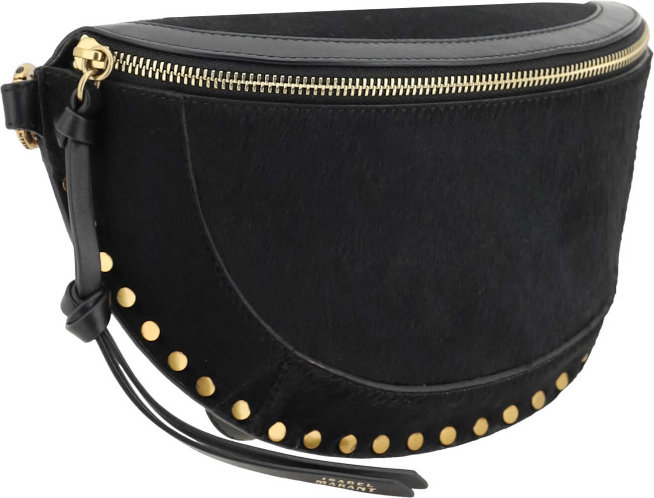 Leather Skano Fanny Pack by Isabel Marant, front zipper closure, adjustable leather shoulder strap, flat stud detail around the perimeter, one interior compartment, pony skin finish.