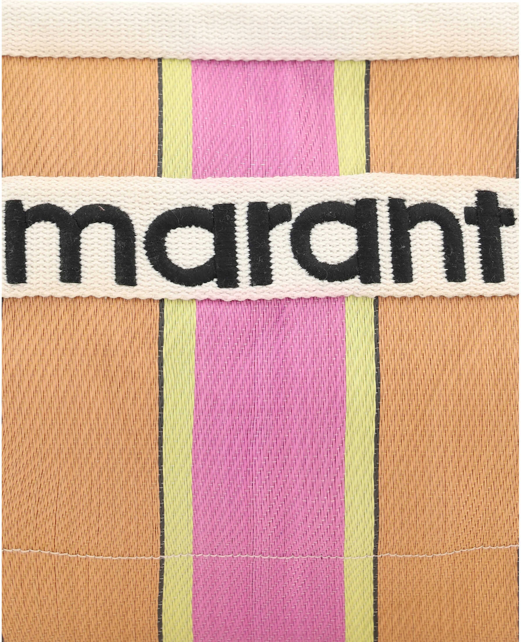 Powden Pouch Bag by Isabel Marant, top zipper closure, one interior compartment, iconic brand monogram stitched in contrast on front, all-over striped pattern.