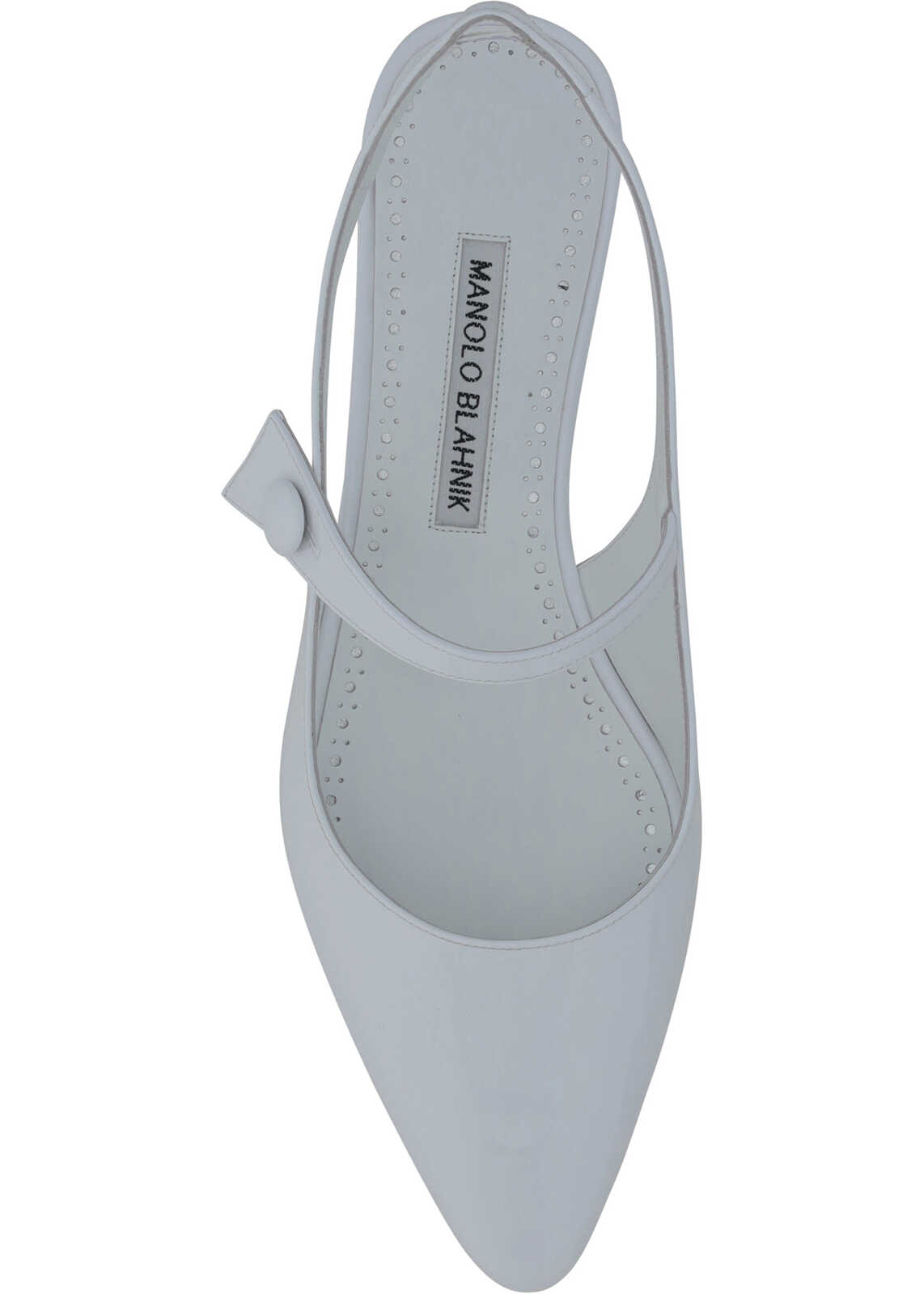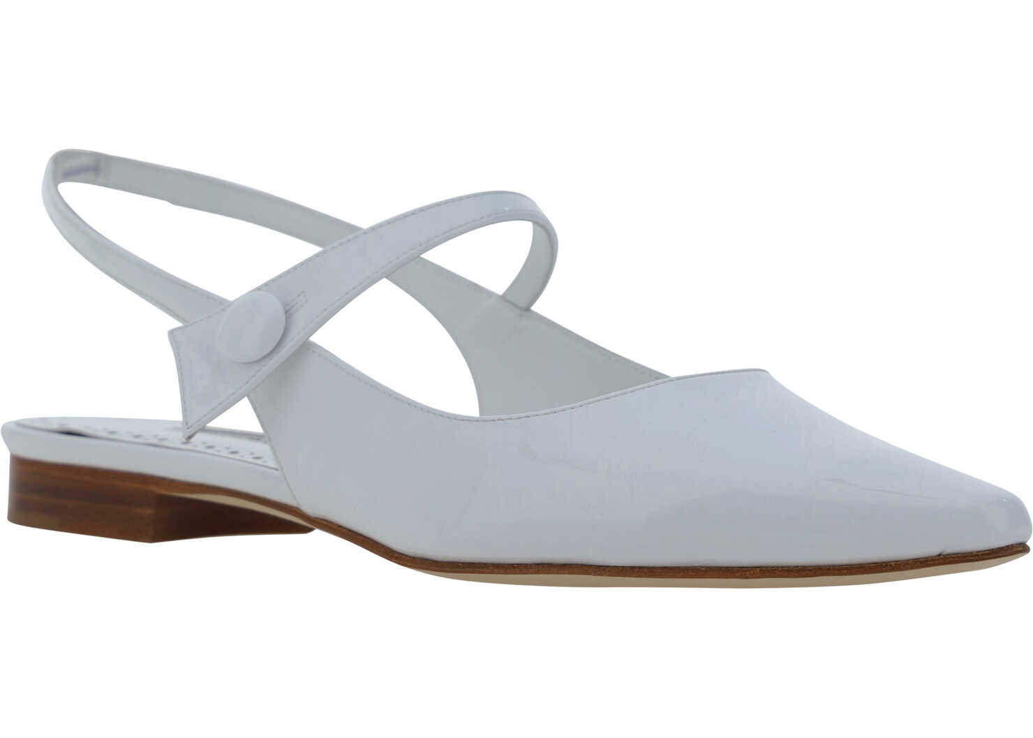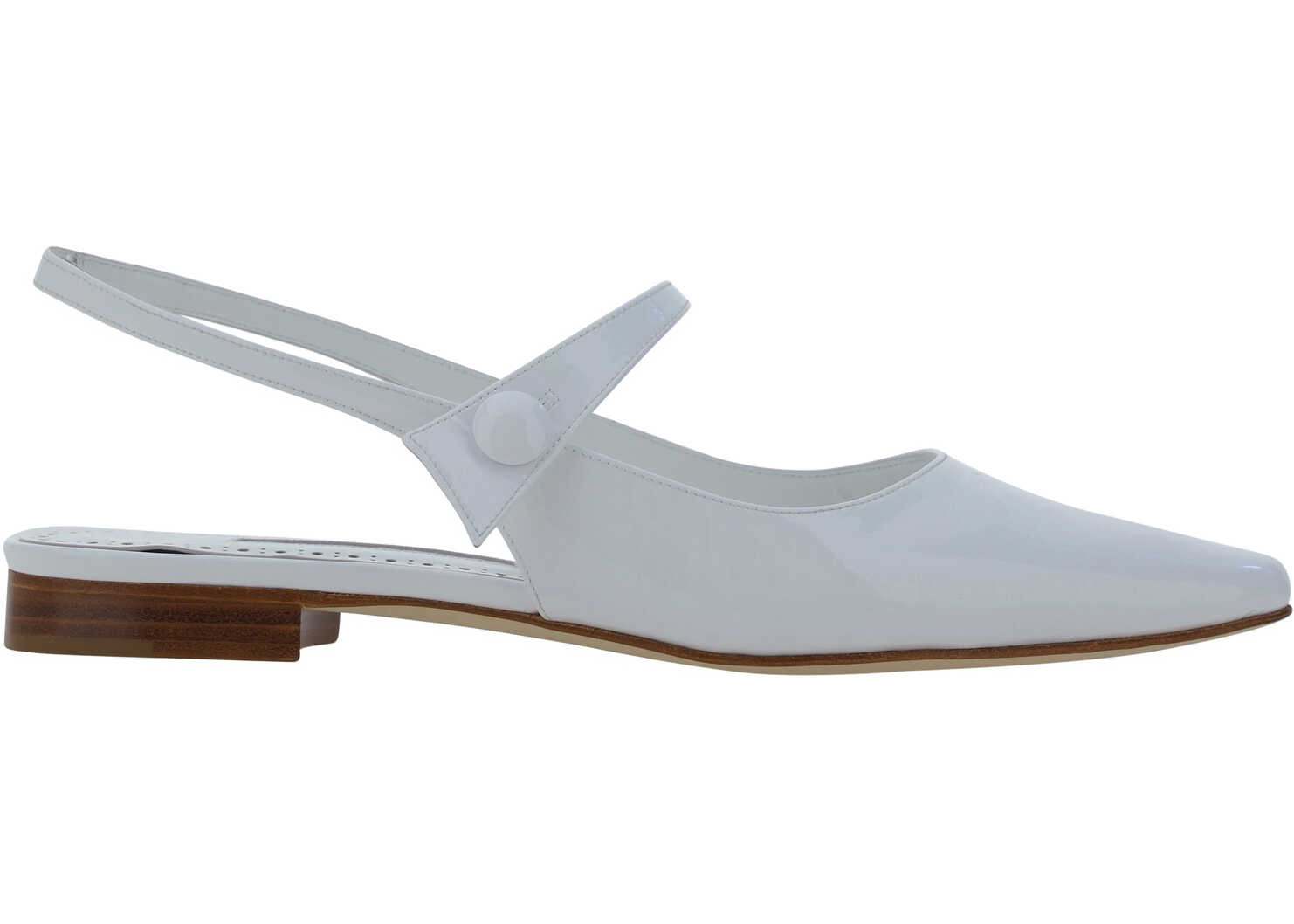 Calfskin Fabio Didion Ballerinas by Manolo Blahnik, patent leather design, elongated front toe, slight leather block heel, leather slingbck at heel, applique strap at back of foot, contrasting logo insole.