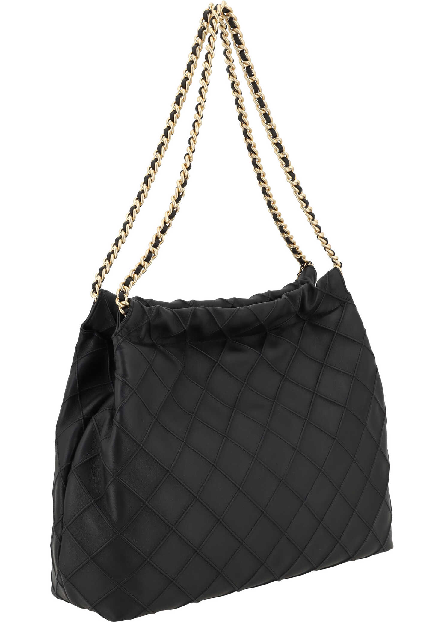 Leather Fleming Soft Shoulder Bag by Tory Burch, magnet button closure at top, two chain handles with contrasting leather inserts, single interior compartment, all-over plaid design.