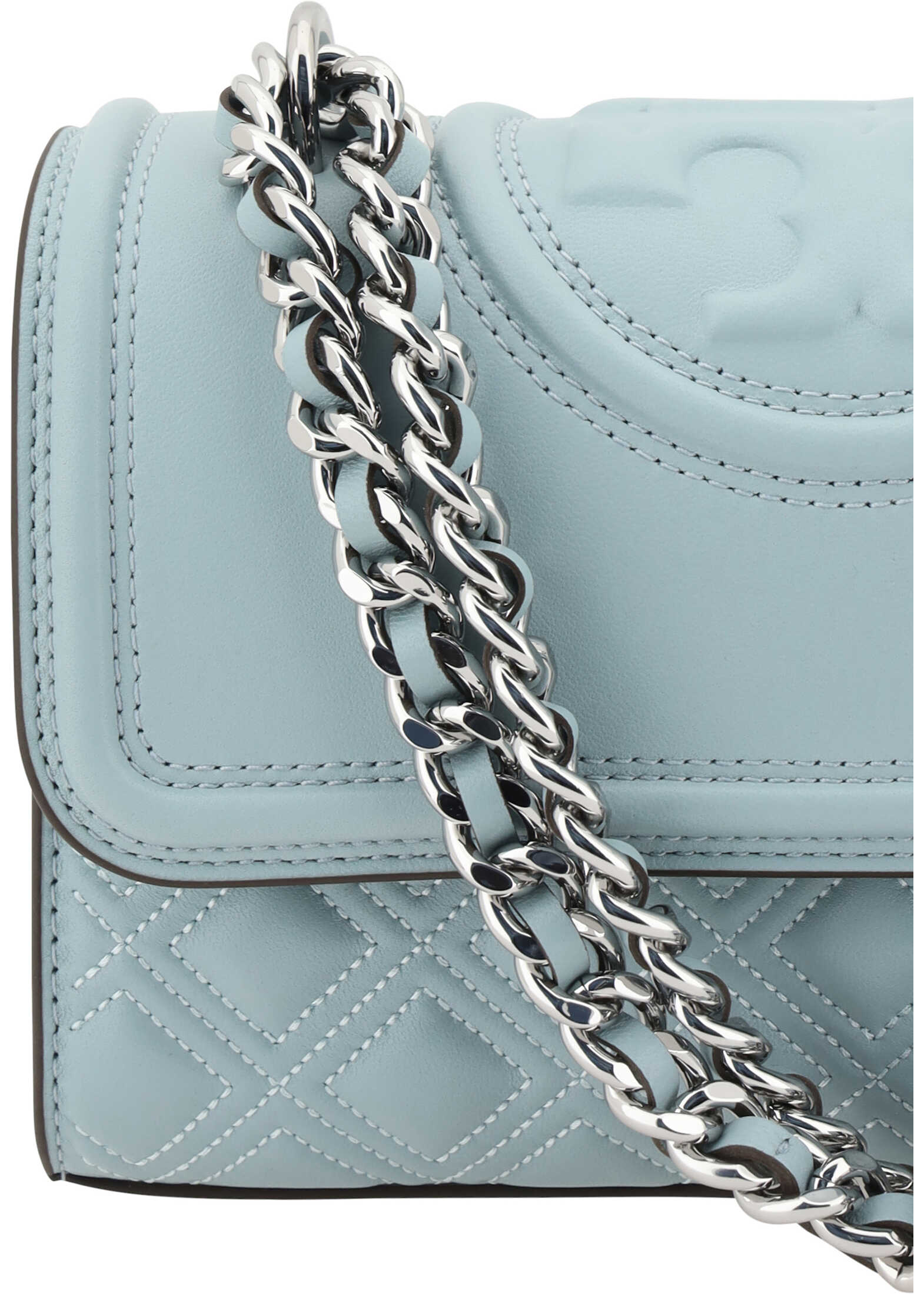 Leather Small Fleming Shoulder Bag by Tory Burch, magnetic flap closure at front, padded and quilted design at front and back, sliding chain strap with leather inserts, maxi brand logo press-stamped on flap at top, single interior compartment, interior card slot pocket, welt pocket with magnet button in back panel.