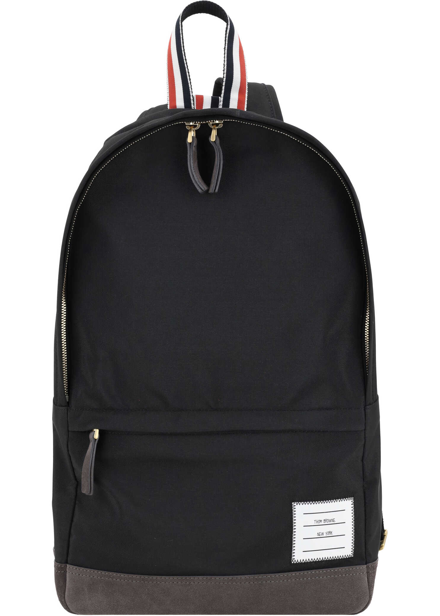 Backpack by Thom Browne, double-slider zipper closure, front zippered patch pocket, top handle with brand's iconic colored band detail, adjustable shoulder straps, iconic brand monogram patch printed on front, suede backpack base.