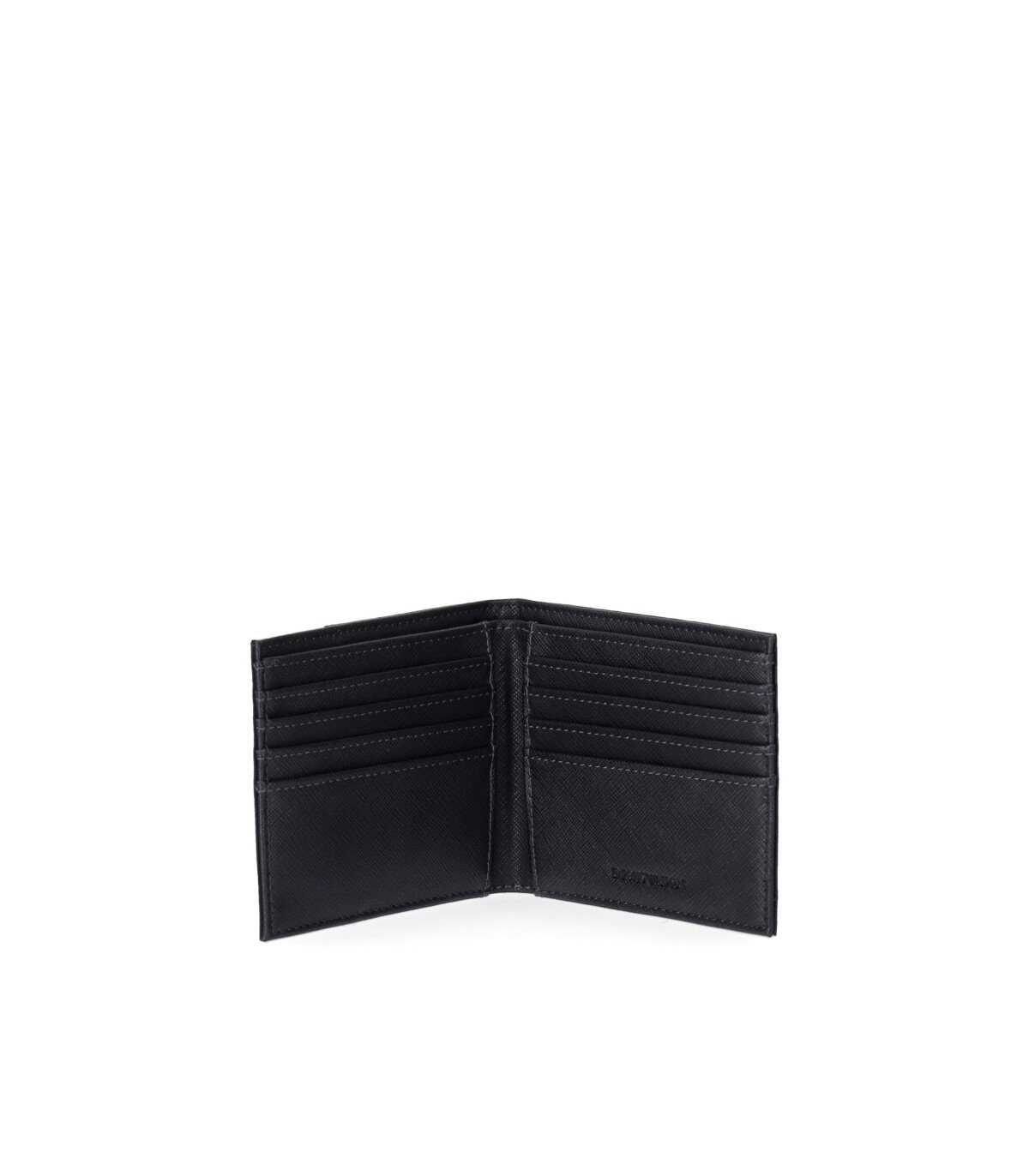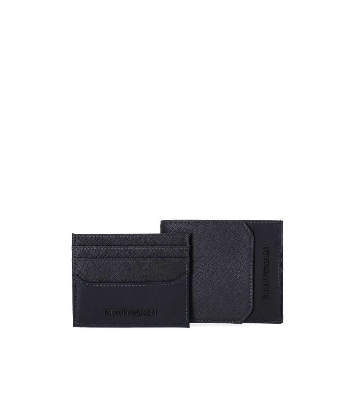 Set by Emporio Armani consisting of a wallet and card holder made from matching blue hammered leather. Decorated with the Emporio Armani logo in tone. Wallet dimensions 9x11x2 cm. Card holder dimensions 10x8x2 cm.