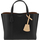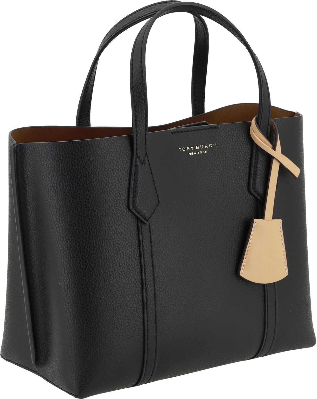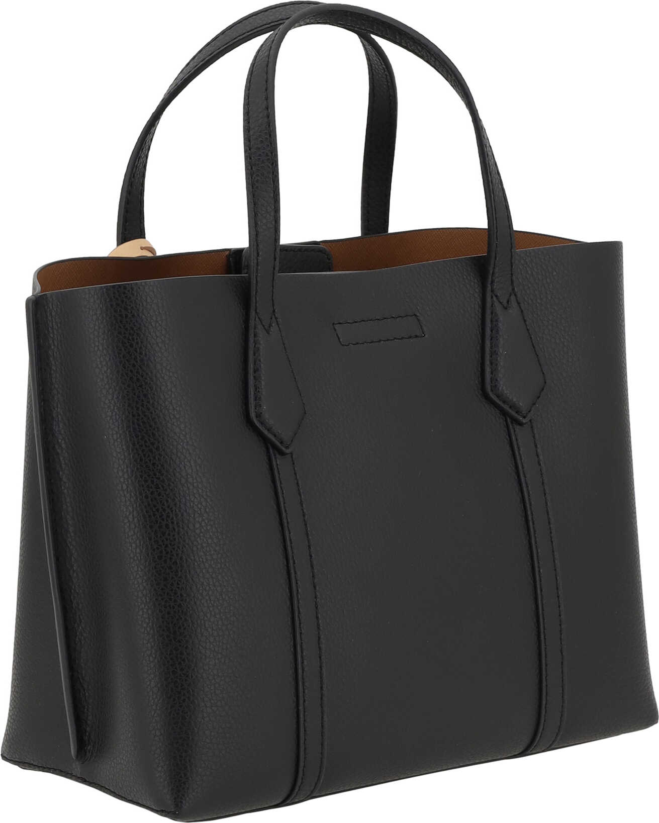 Leather Perry Small Handbag by Tory Burch, grained leather design, two flat top handles, adjustable and removable flat shoulder strap, three interior compartments, magnetic button closure at top, key ring charm attached to base of handle, iconic brand monogram stamped on front.