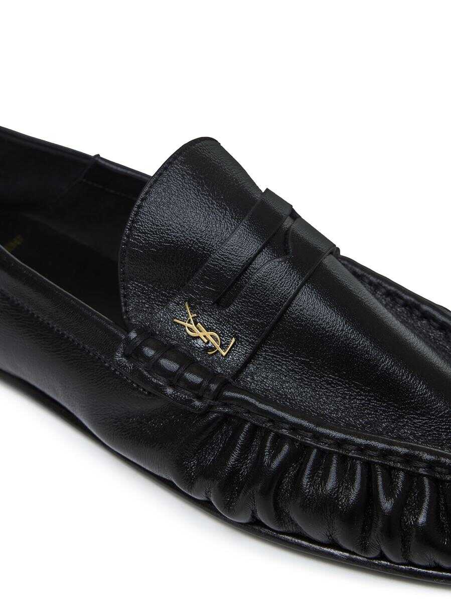 Saint Laurent’s Le Loafer black leather moccasins featuring curled stitching along the rounded almond toe, gold-tone YSL Cassandre logo plaque on the front strap, fold-over back panel and flat leather sole.