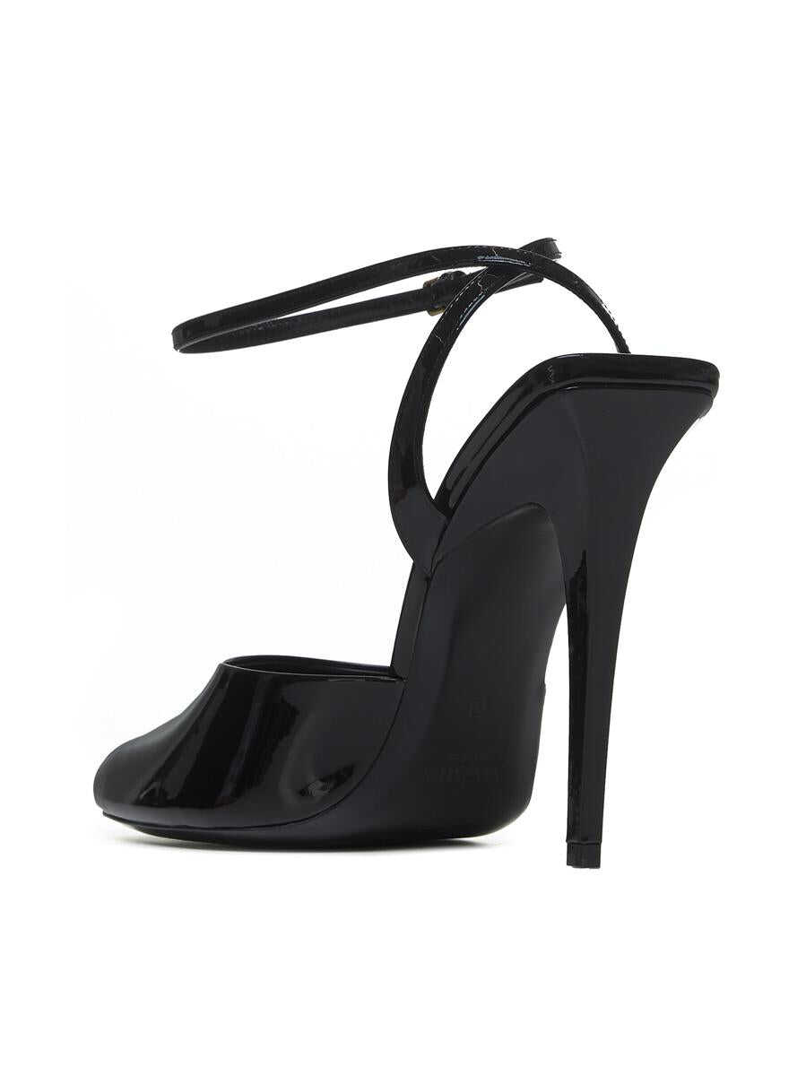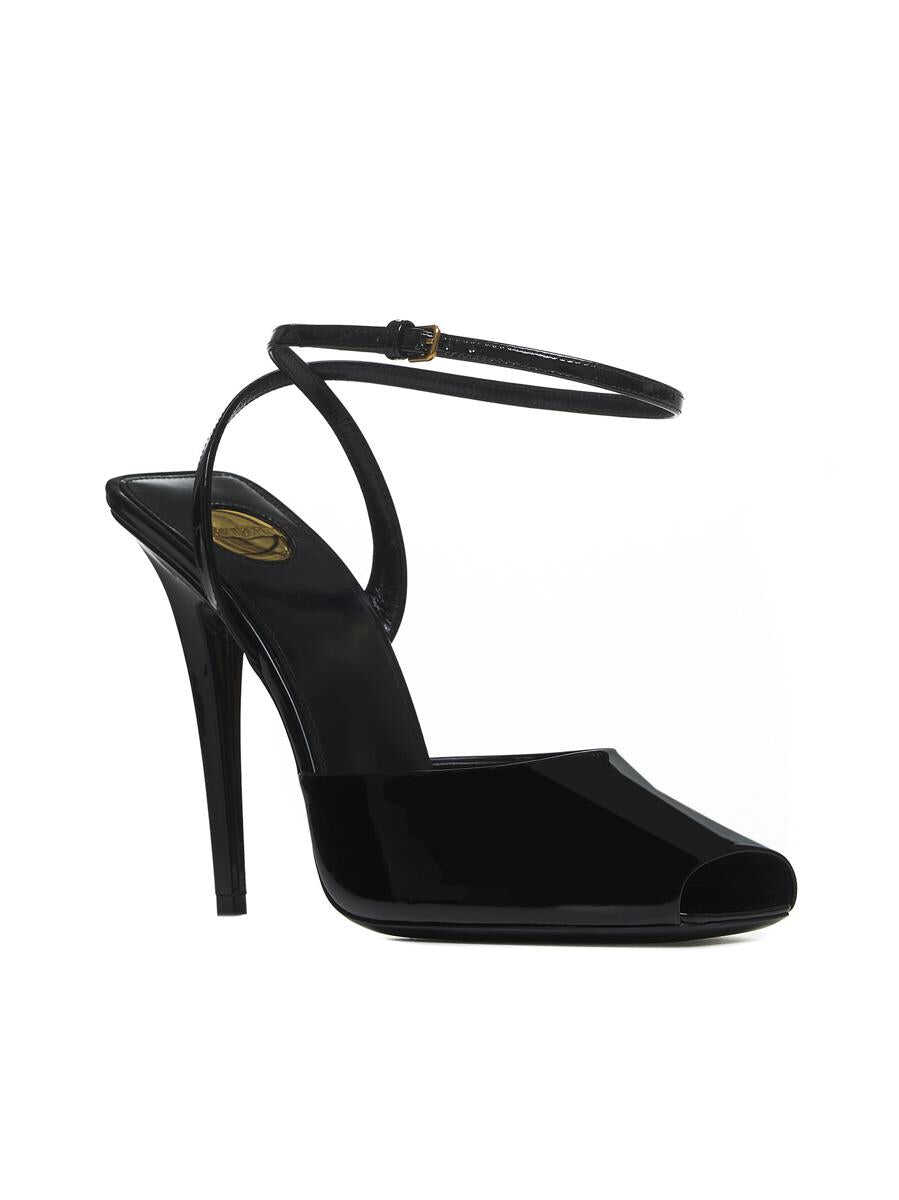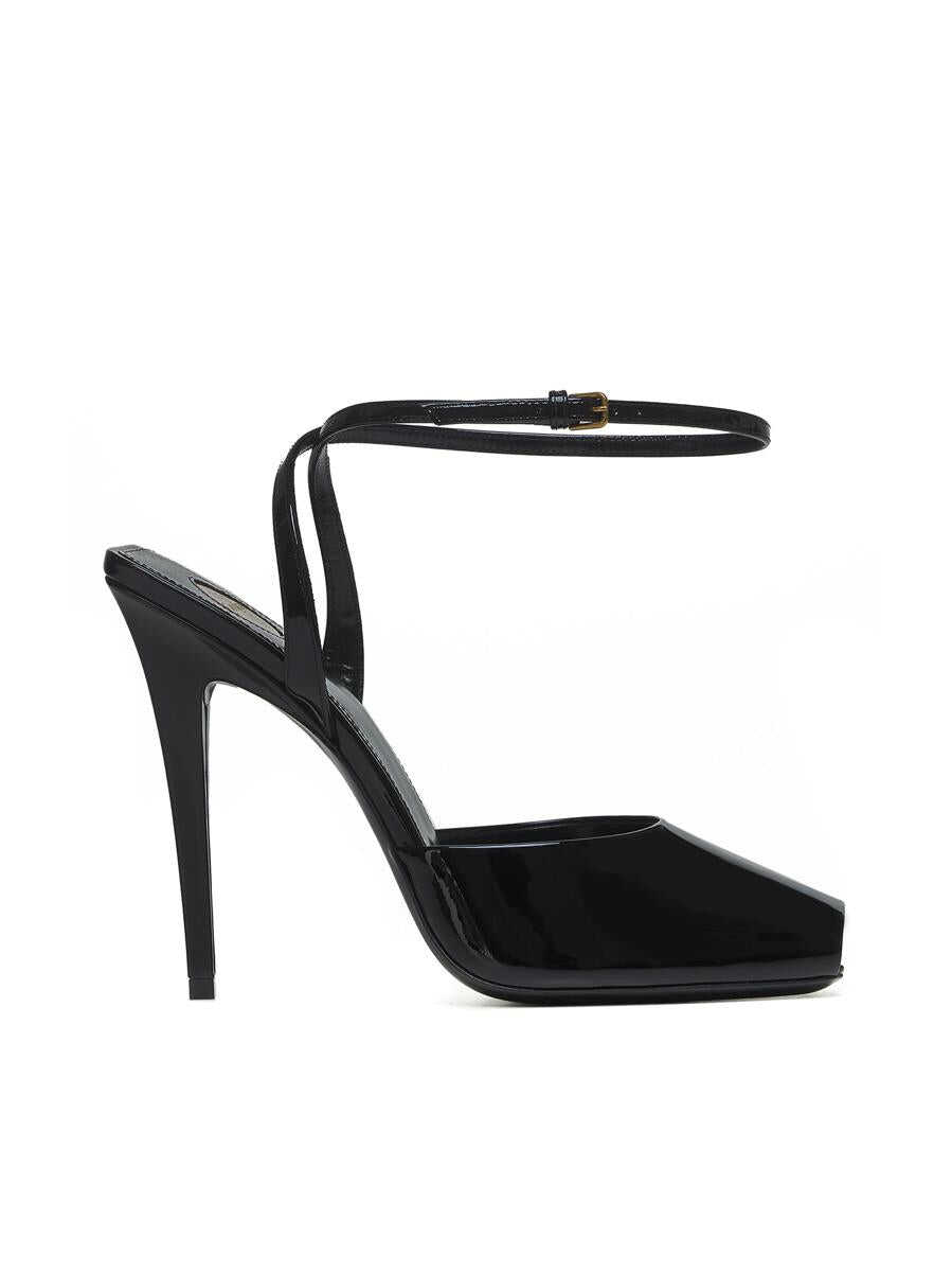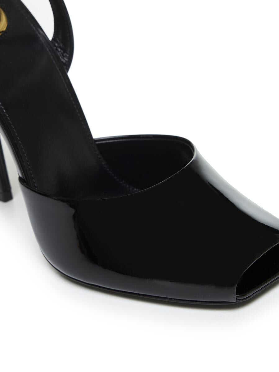 Saint Laurent’s La Scandale black patent leather sandals featuring a square toe with cut-out, a thin ankle strap with adjustable buckle, leather lining, insole and sole and a high stiletto heel.