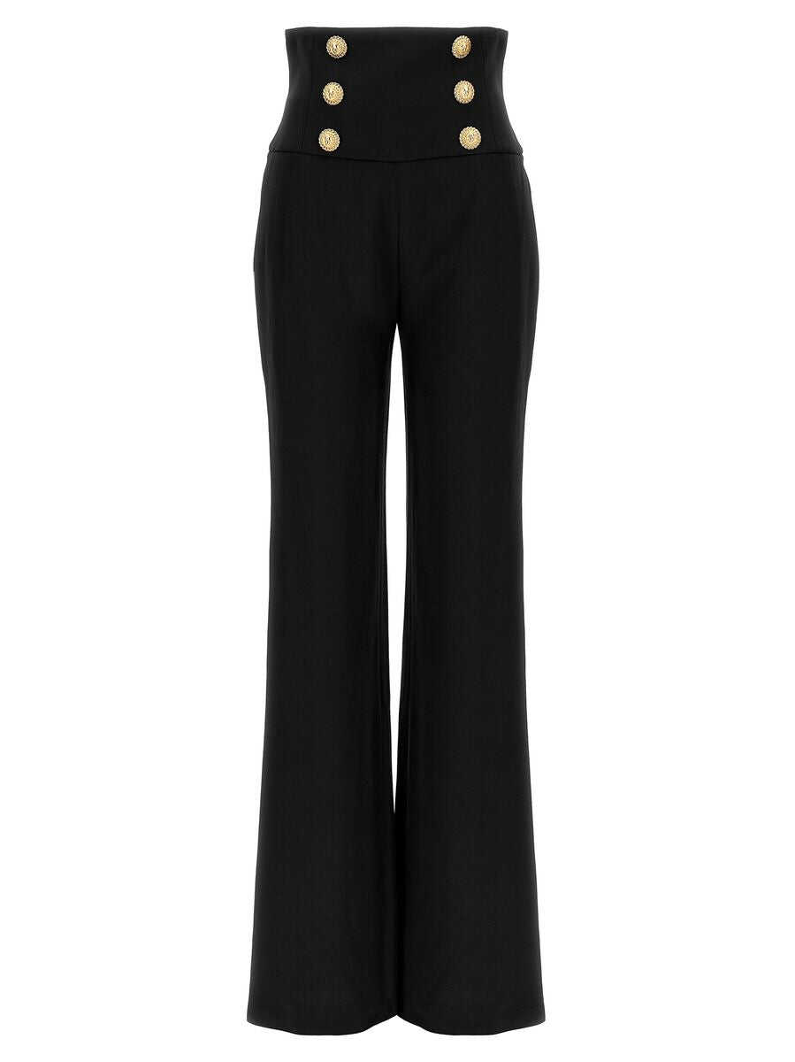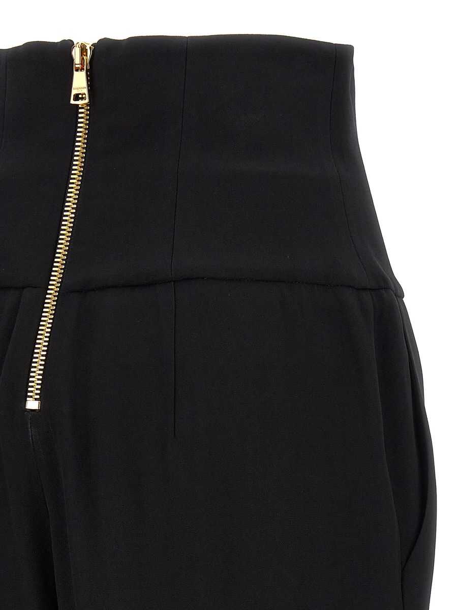 High-waisted viscose pants, gold metal 'Chiocciola' buttons, pockets, and back zip closure