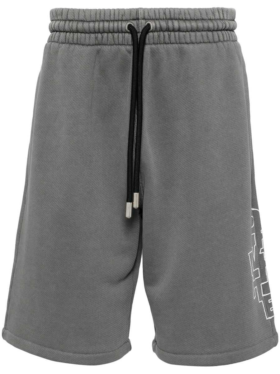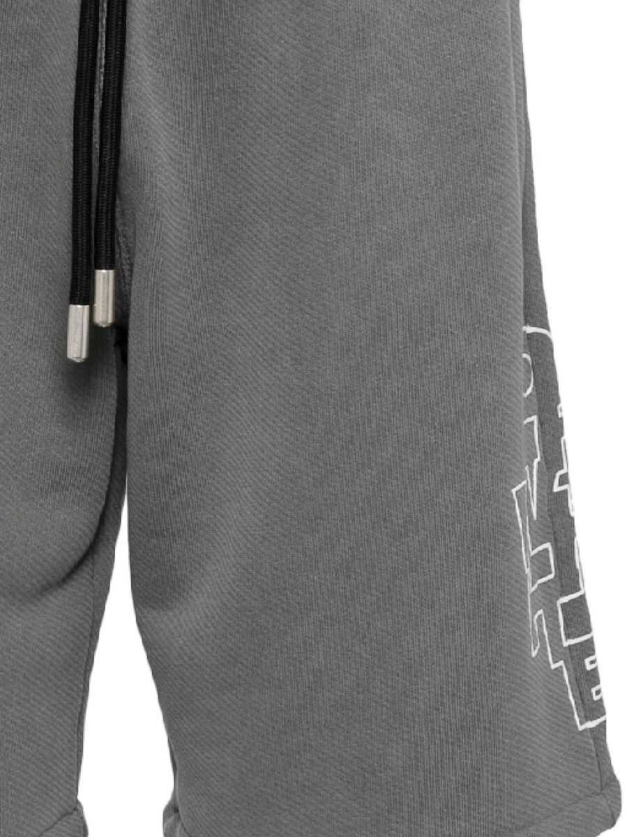 medium grey cotton jersey texture elasticated drawstring waistband logo print to the side and rear two side inset pockets rear patch pocket straight hem
