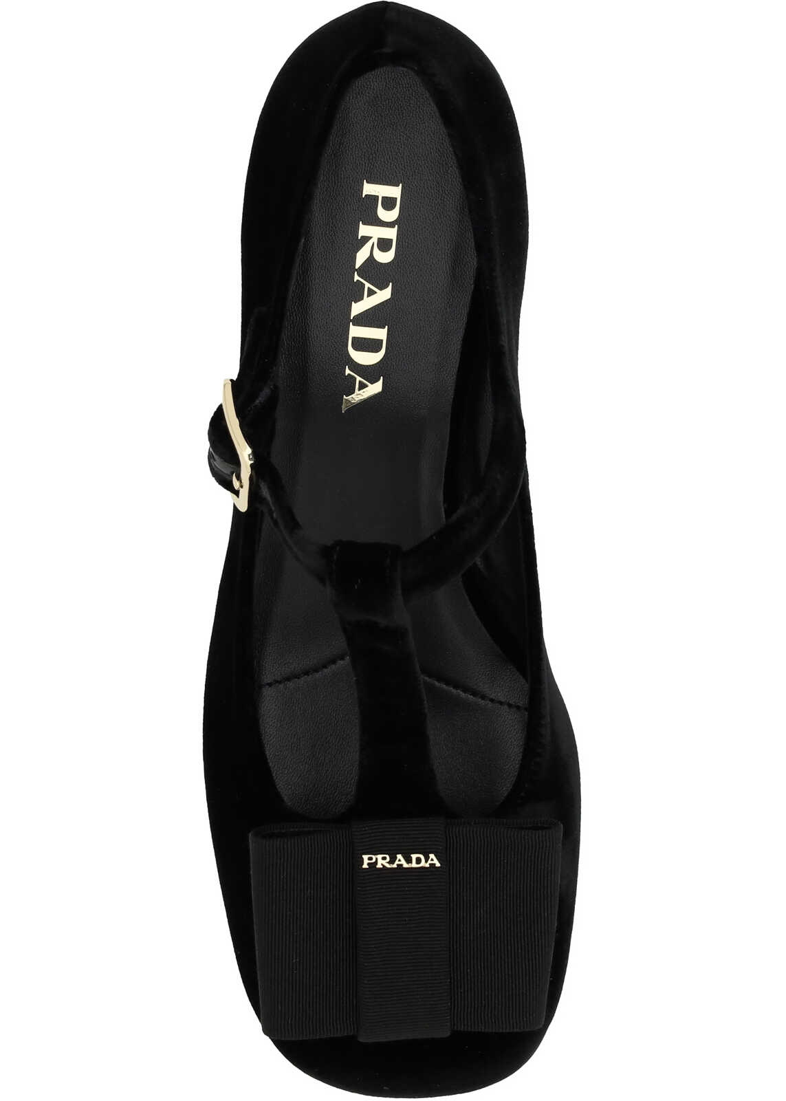 Ballerinas by Prada, square toe, block heel, velvet design, adjustable buckle closure, oversized bow detail applied to front with iconic three-dimensional brand monogram, logo-embossed insole.