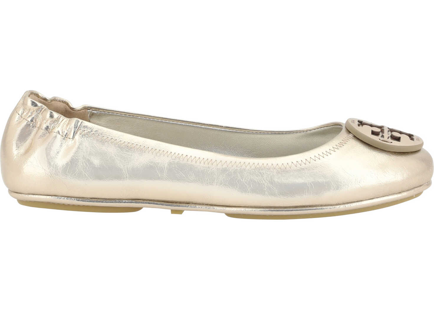 Leather Minnie Ballerinas by Tory Burch featuring a grained leather design, a round toe, a three-dimensional plaque with the brand's iconic applique logo on the front, a metallic finish, and an elasticized heel.