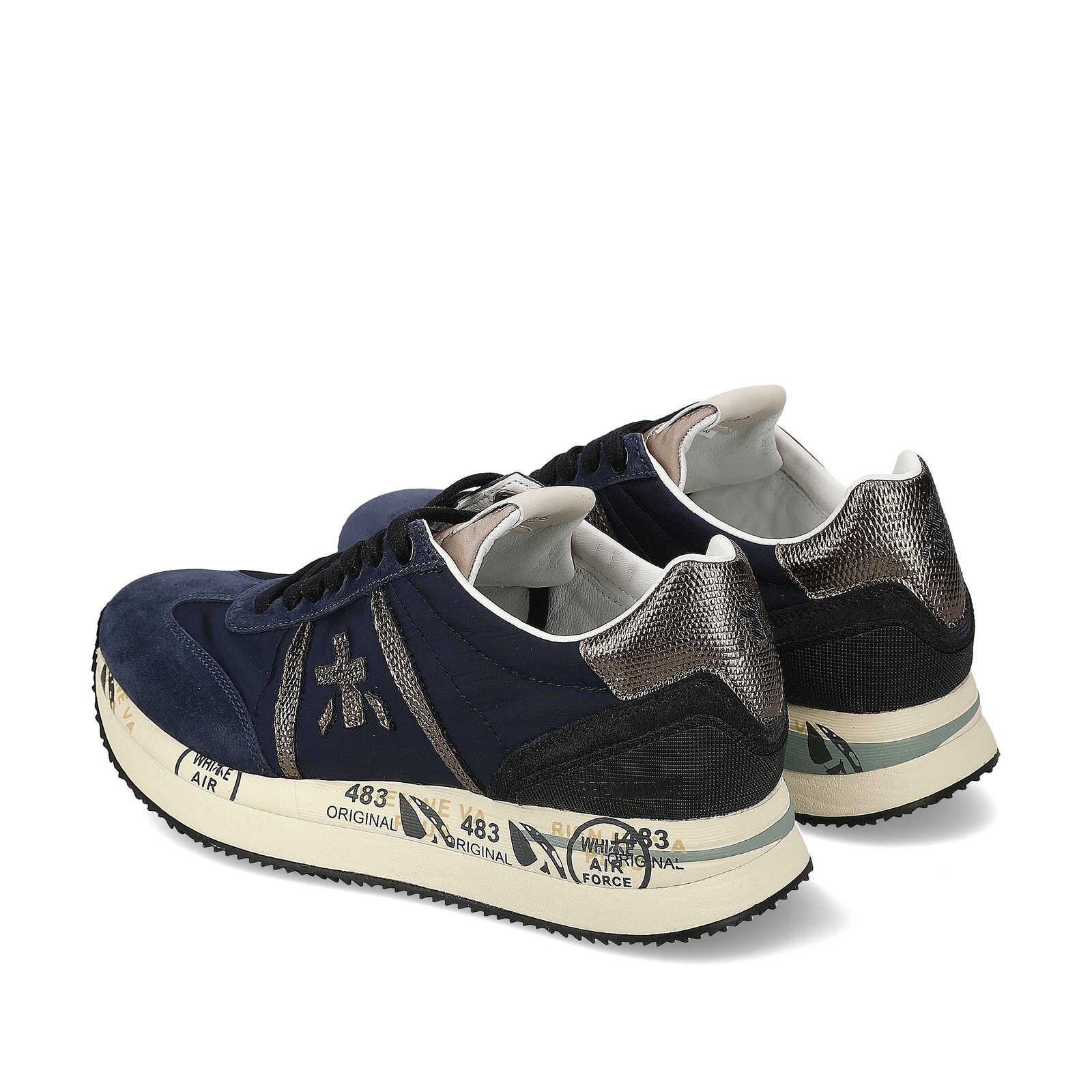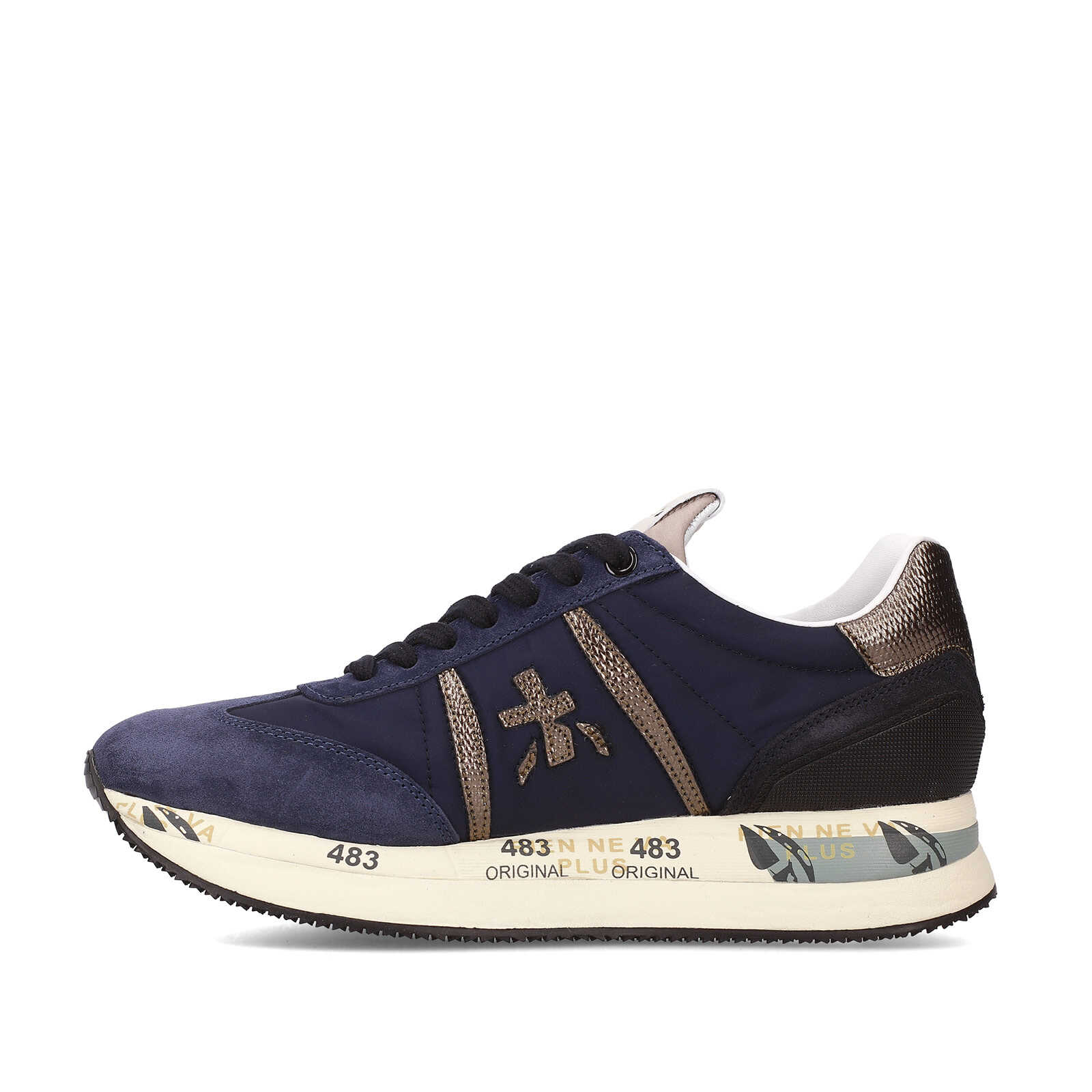 Sneaker Premiata donna modello Conny.Realizzata in suede e nylon blu con tallone e profili laterali in pelle stampa lucertola color acciaio.Plantare anatomico estraibile.Calzata regolare e suola logata.