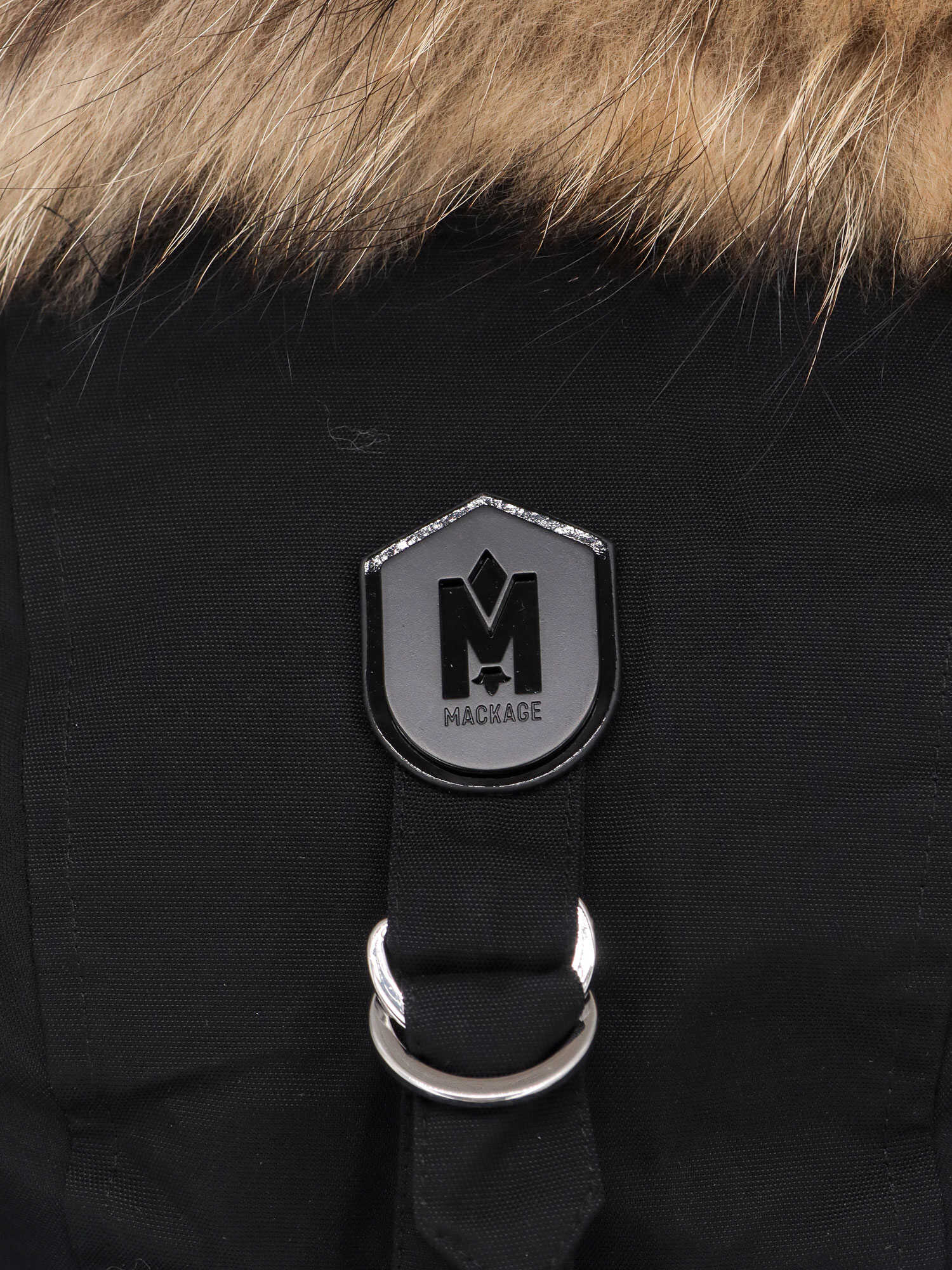 Stay warm and stylish in this Black Padded nylon jacket by MACKAGE. Featuring a hood with fur lining, zip and snap button closure, and four front pockets. Made with 59% nylon and 41% polyester, with 90% down and 10% feather padding. Perfect for chilly days!