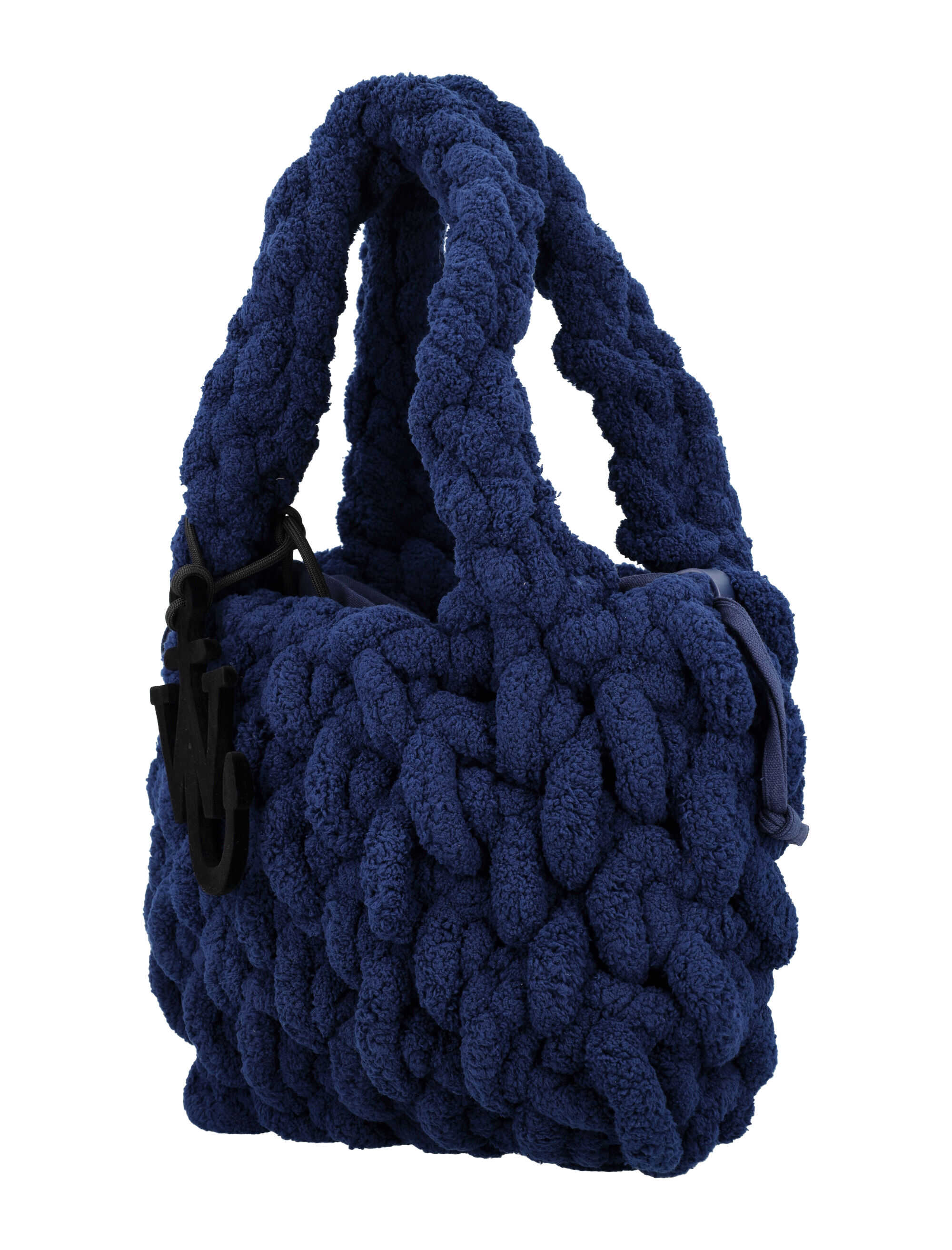 Indulge in luxury with the Small Blanket bag by JW Anderson. Crafted with soft shearling material and a chunky knit texture, this bag features thick handles, a black JW Anderson logo charm, and a drawstring closure. The 100% polyester lining and 100% cotton material ensure durability and style. Height: 28cm Width: 35cm Depth: 10cm. Elevate your accessory game with this must-have handbag!