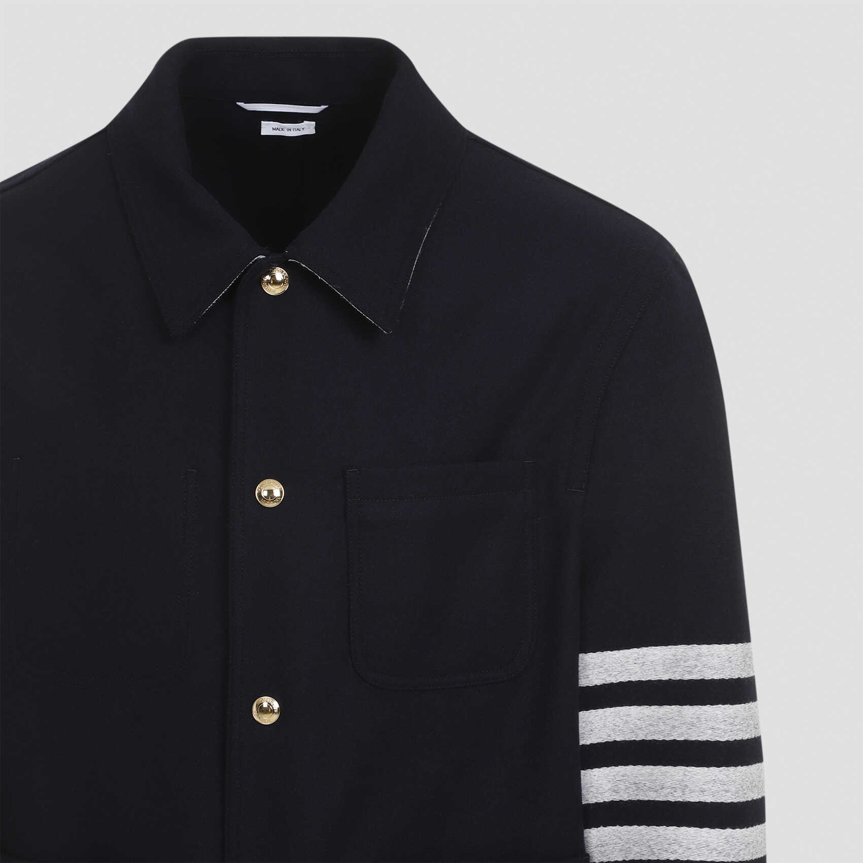 Elevate your style with this Thom Browne wool jacket. Made from a luxurious blend of wool and cashmere, it features a pointed collar, button closure, and signature 4-stripes on the sleeve. With three patch pockets and a branded loop, this jacket is both stylish and functional. Perfect for any occasion, this jacket is a must-have for any fashion-forward man.