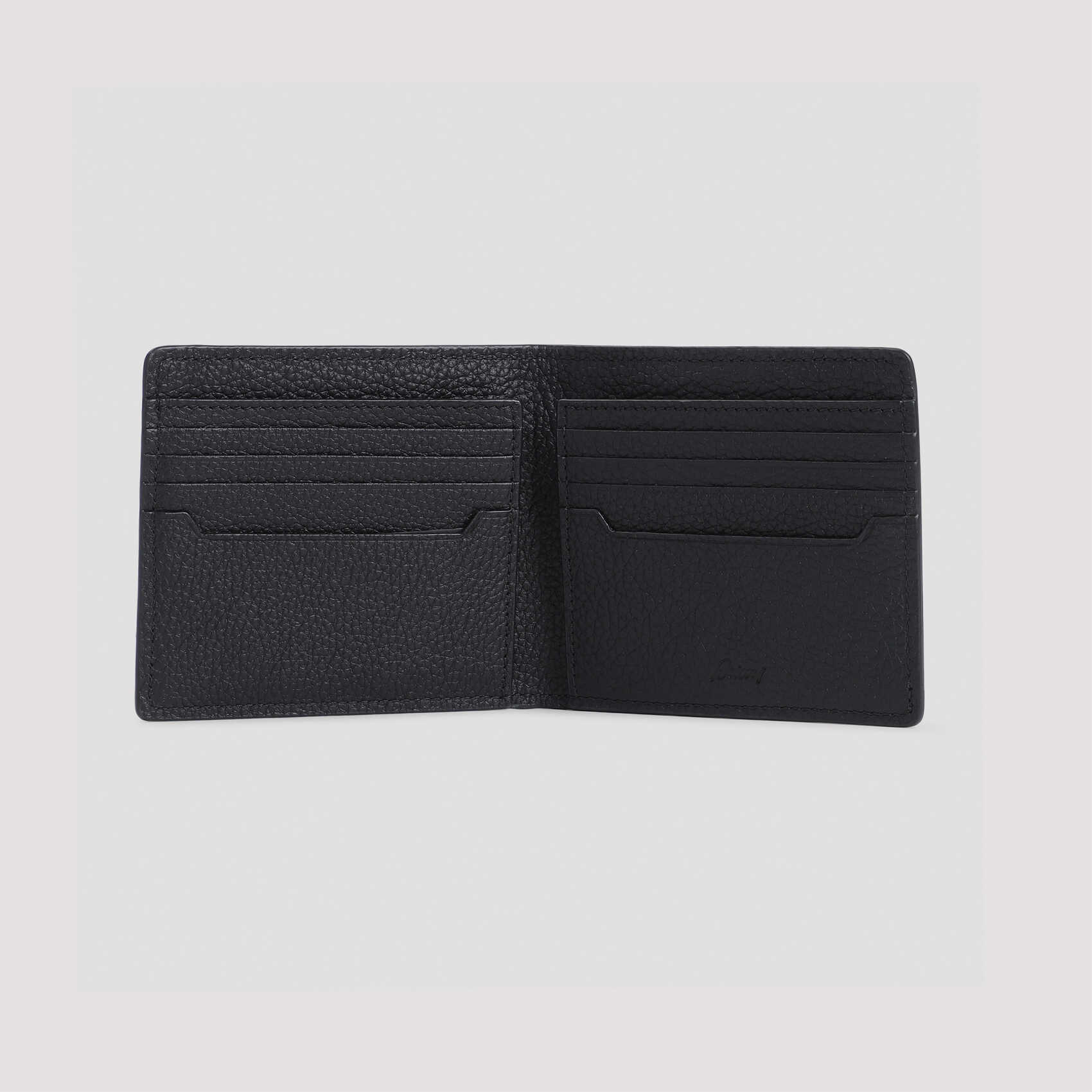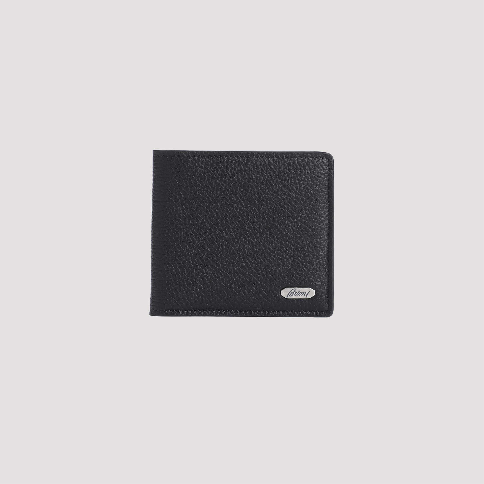 Upgrade your style with this sleek Brioni black grained leather card case. Featuring a silver-toned branded plaque, eight credit card slots, and a bill compartment, this accessory is perfect for the modern man on the go. Hand-painted edges add a luxurious touch. Dimensions: W:10cm H:9cm D:1cm. Crafted from 100% grained leather, this is a must-have for any fashion-forward individual.