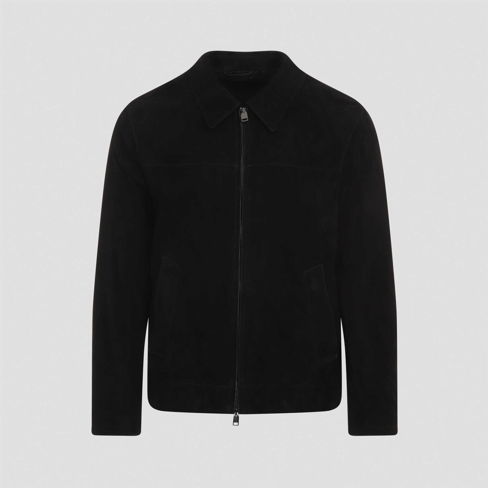 Elevate your style with this luxurious BRIONI black suede leather blouson. Featuring a pointed collar, front zip closure, and fully lined for comfort. Perfect for any occasion, this jacket is a must-have for the modern man. Add a touch of sophistication to your wardrobe with BRIONI.