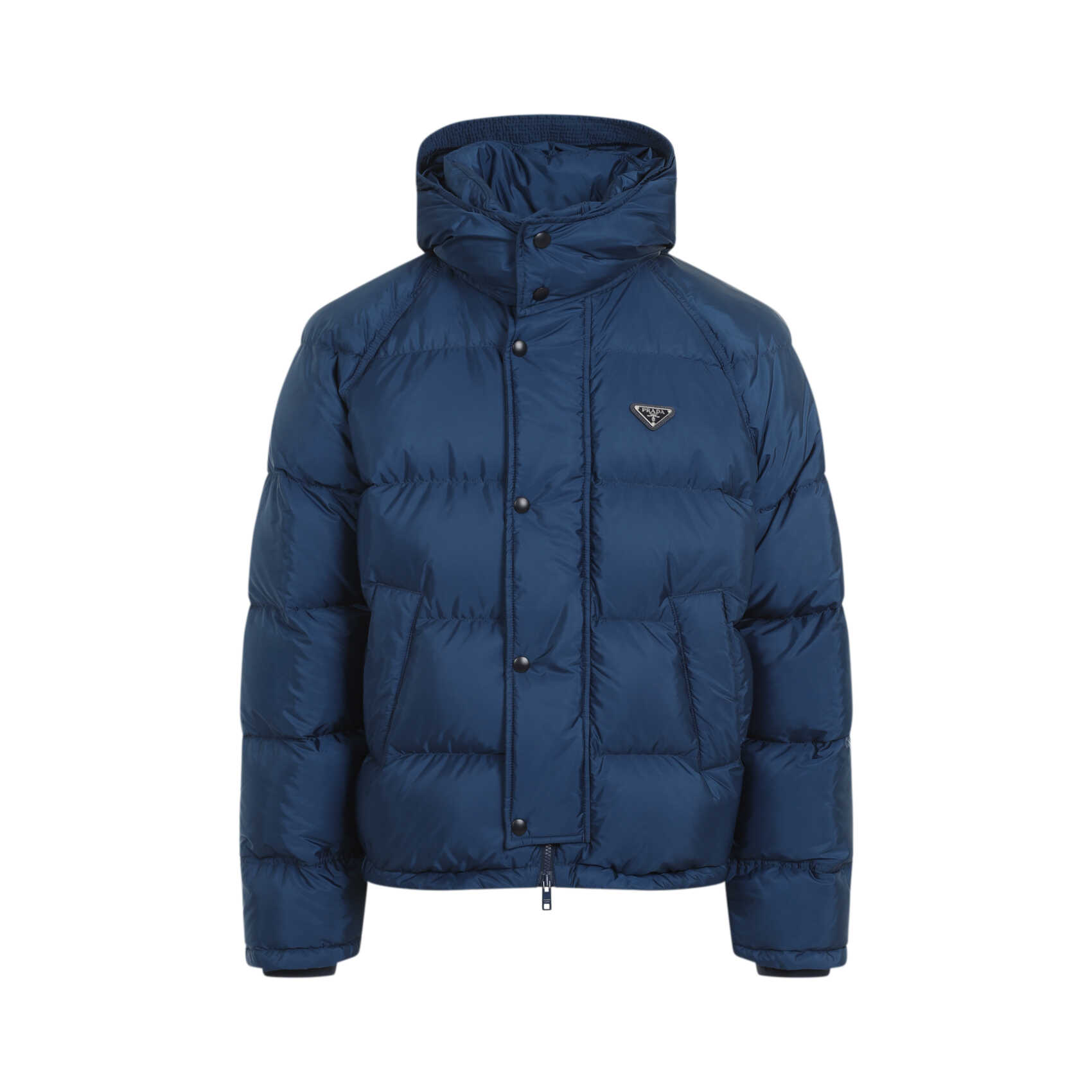 Stay warm and stylish with this Prada aviation blue down jacket. Made from high-quality polyamide fabric, it features a stand-up collar, tonal hood, and metallic triangle logo on the chest. With side pockets, long sleeves, and a padded design, this jacket is perfect for any man's wardrobe. Elevate your style with the iconic Prada brand.