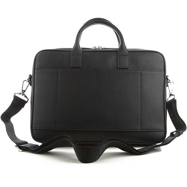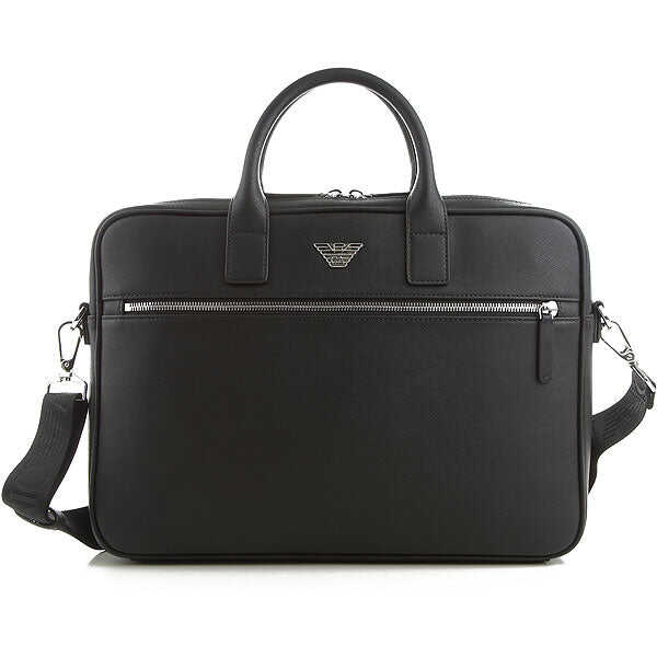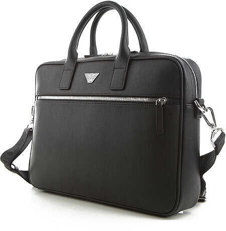 Stand out with this sleek and stylish black Emporio Armani briefcase. Featuring double rigid handles, an external zip pocket, and a detachable shoulder strap, this bag is perfect for the modern man on the go. With a dust bag included, you can keep it looking sharp at all times. Dimensions: 27 cm in height, 38 cm in length, and 6 cm in width. Made from high-quality polyester, this briefcase exudes sophistication and class. Elevate your accessory game with Emporio Armani.