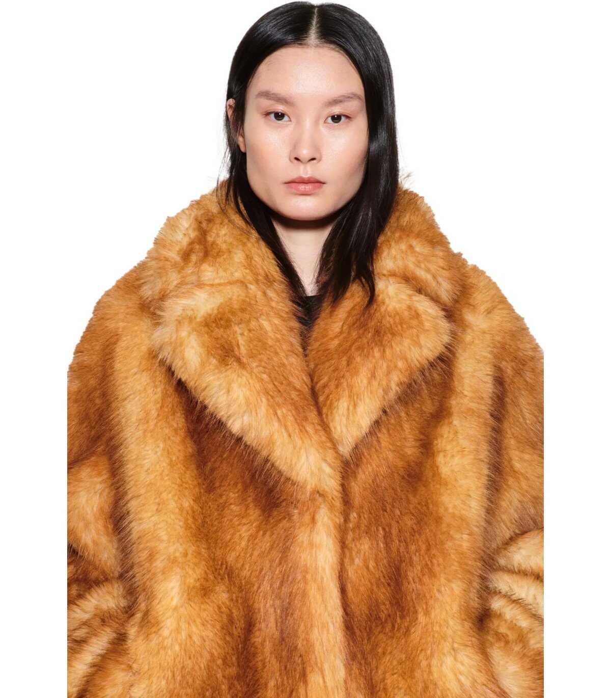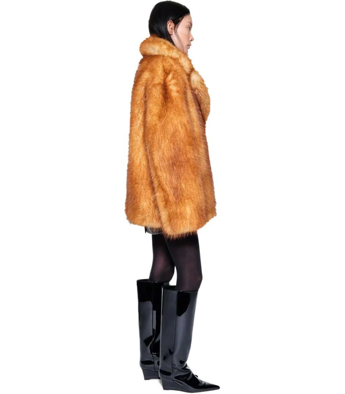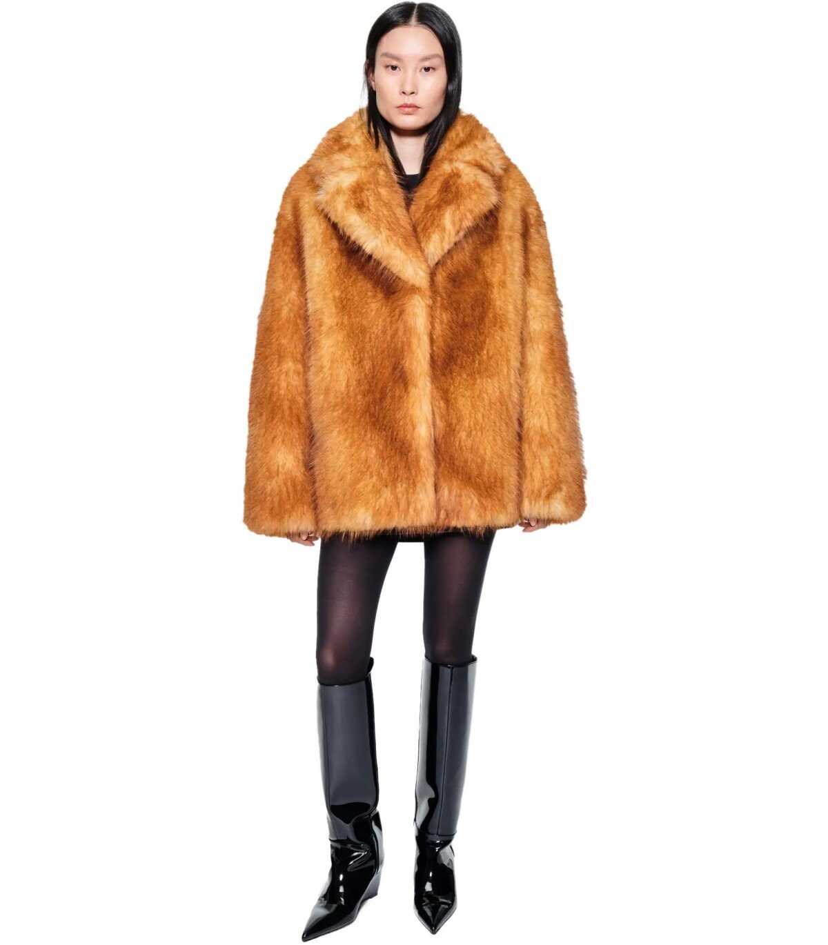 Short Janice jacket by Stand Studio made of elegant synthetic fur fabric in a caramel color. Characterized by a front hook closure, it features a lapel collar. Equipped with side welt pockets. It has a full lining. Oversized fit.