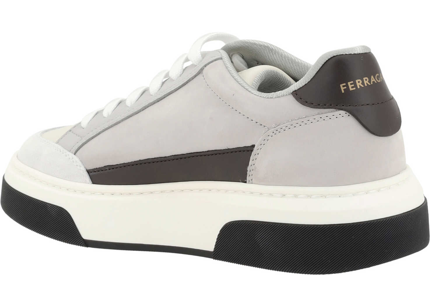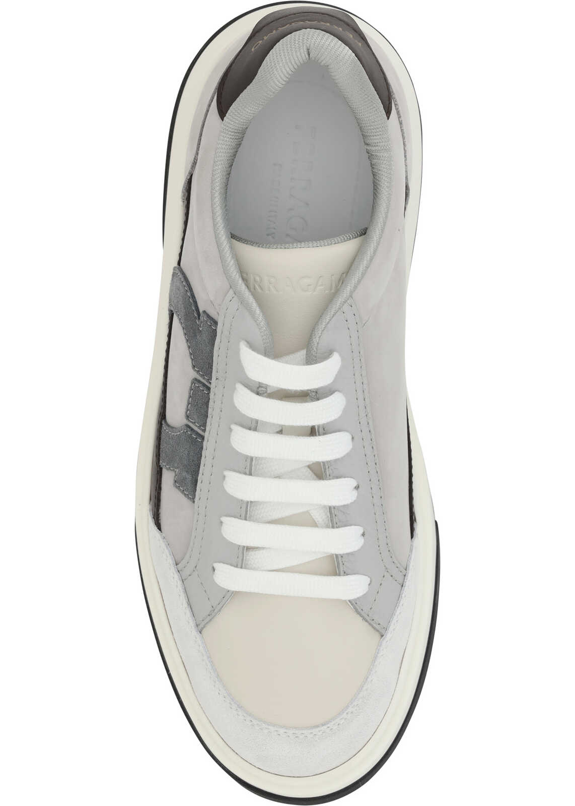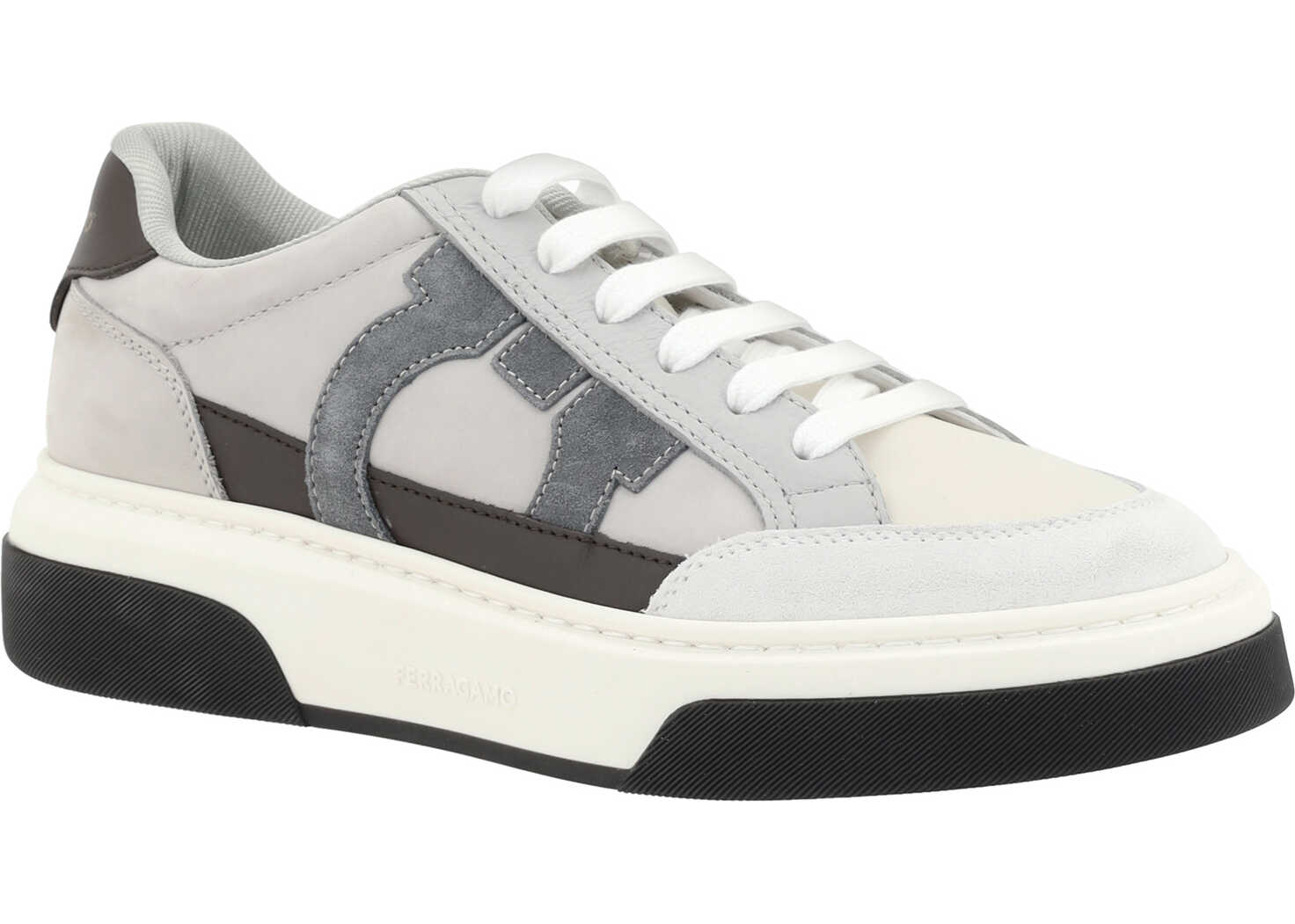 Calfskin Cassina Sneakers by Ferragamo, upper design made of technical mesh, suede leather inserts, line inspired by '90s basketball shoes, iconic contrasting Gancini logo on side panel, knurled edging, logo leather label on heel.