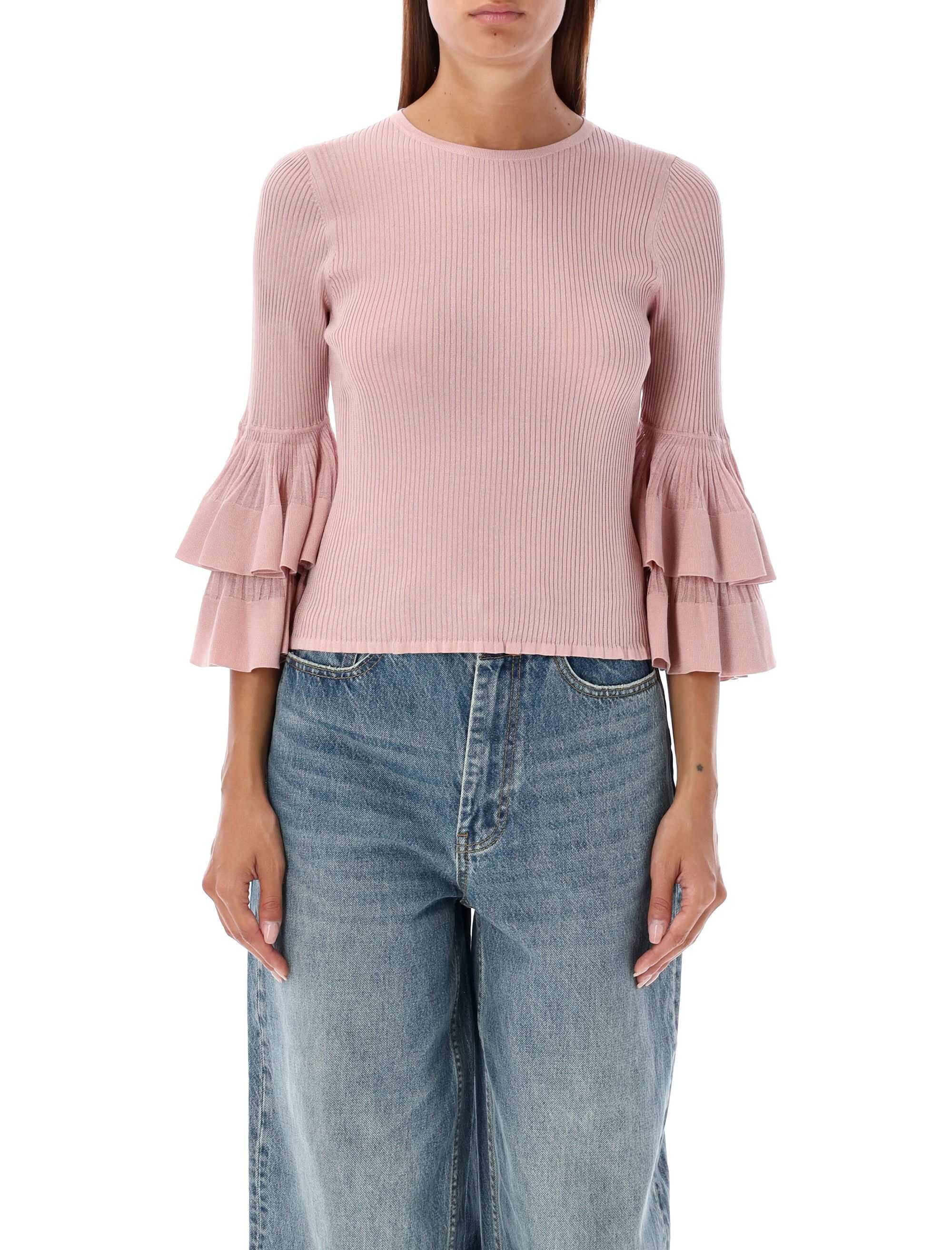 Elevate your wardrobe with Zimmermann's stunning Illustration tiered ruffle top in pink. This exquisite knitwear features a round neck, three-quarter sleeves, and playful tiered ruffles, perfect for a chic look that stands out effortlessly.