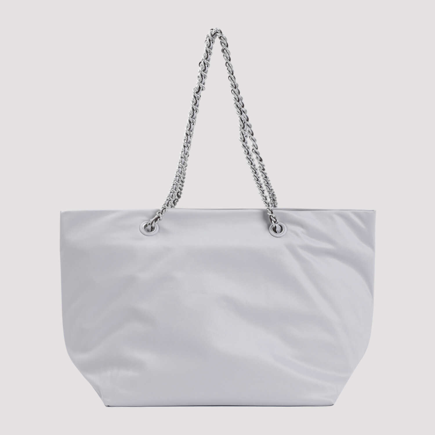 Elevate your style with the chic TORY BURCH 152313 grey nylon tote bag. Featuring sliding silver-toned chain handles, embossed logo detail, and a spacious interior with convenient pockets, this bag is both fashionable and functional. Add a touch of luxury to your everyday look.