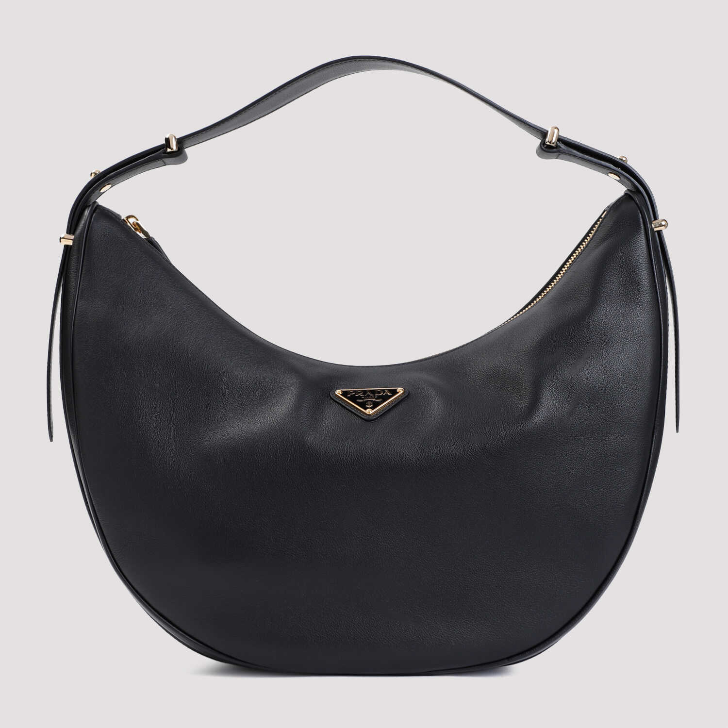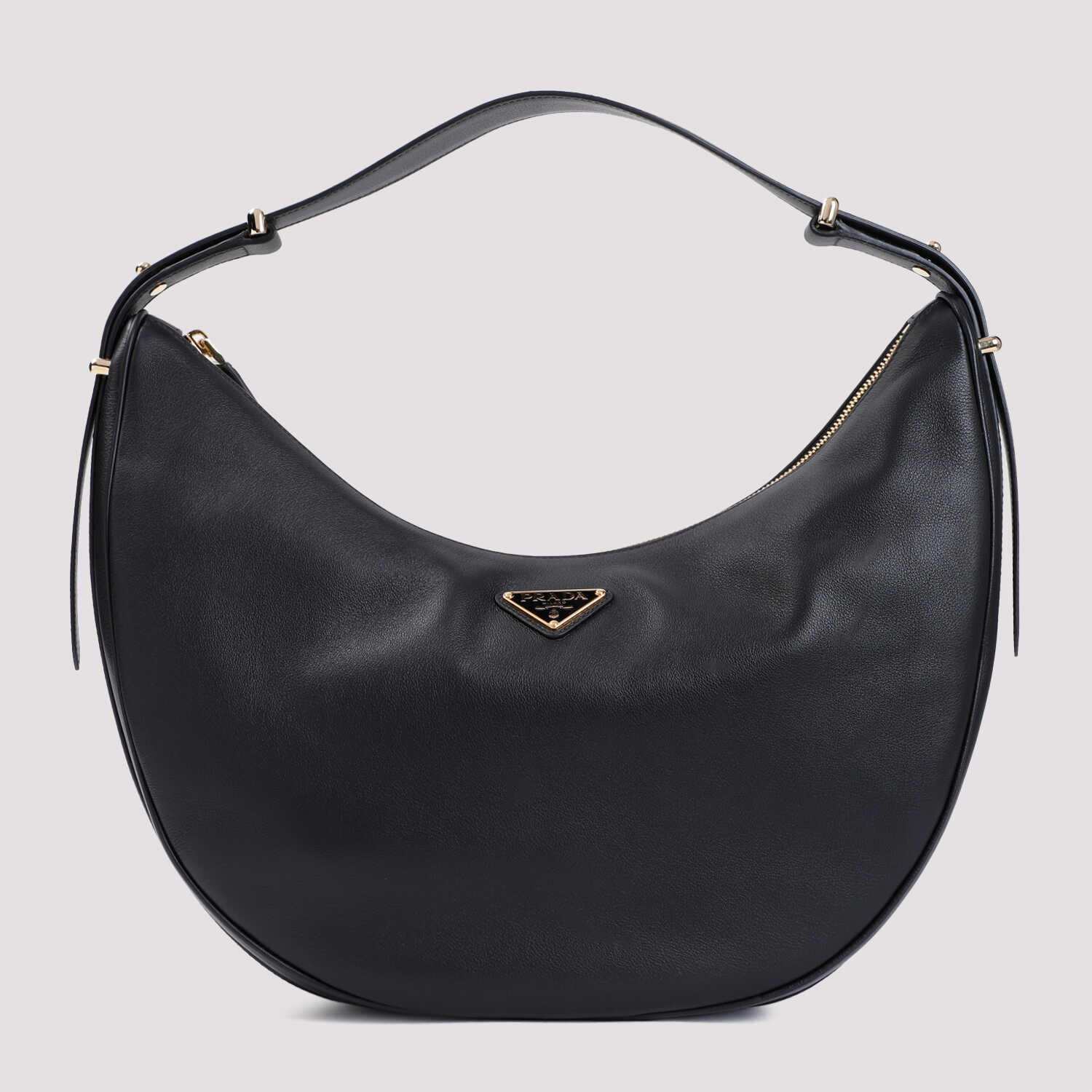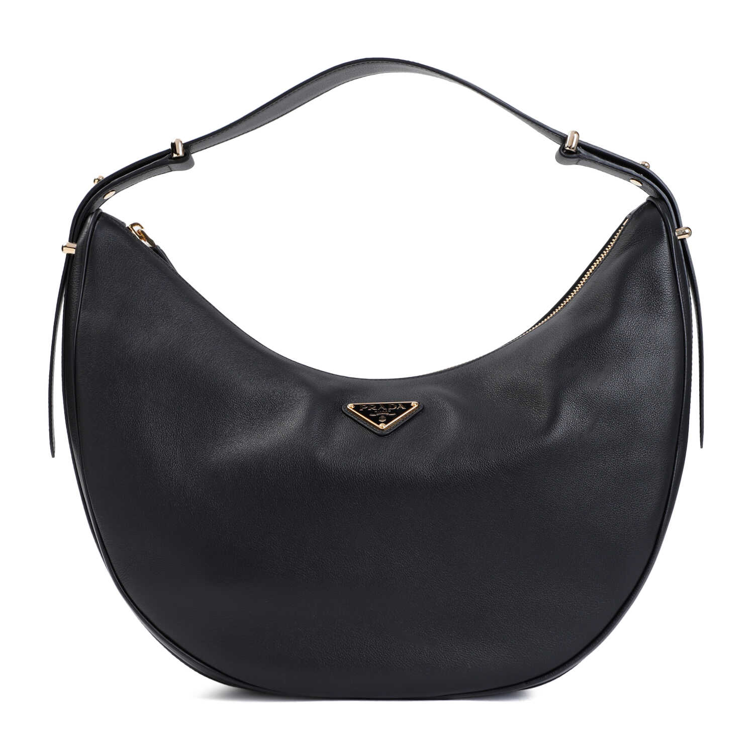 Elevate your style with this luxurious Prada black nappa calf leather shoulder bag. Featuring a hobo bag design with golden-toned hardware and an enameled metal Prada logo. The adjustable handle and inner pocket add functionality to this chic accessory. Made from 100% Nappa Calf Leather. Perfect for any fashion-forward woman. Order yours now!