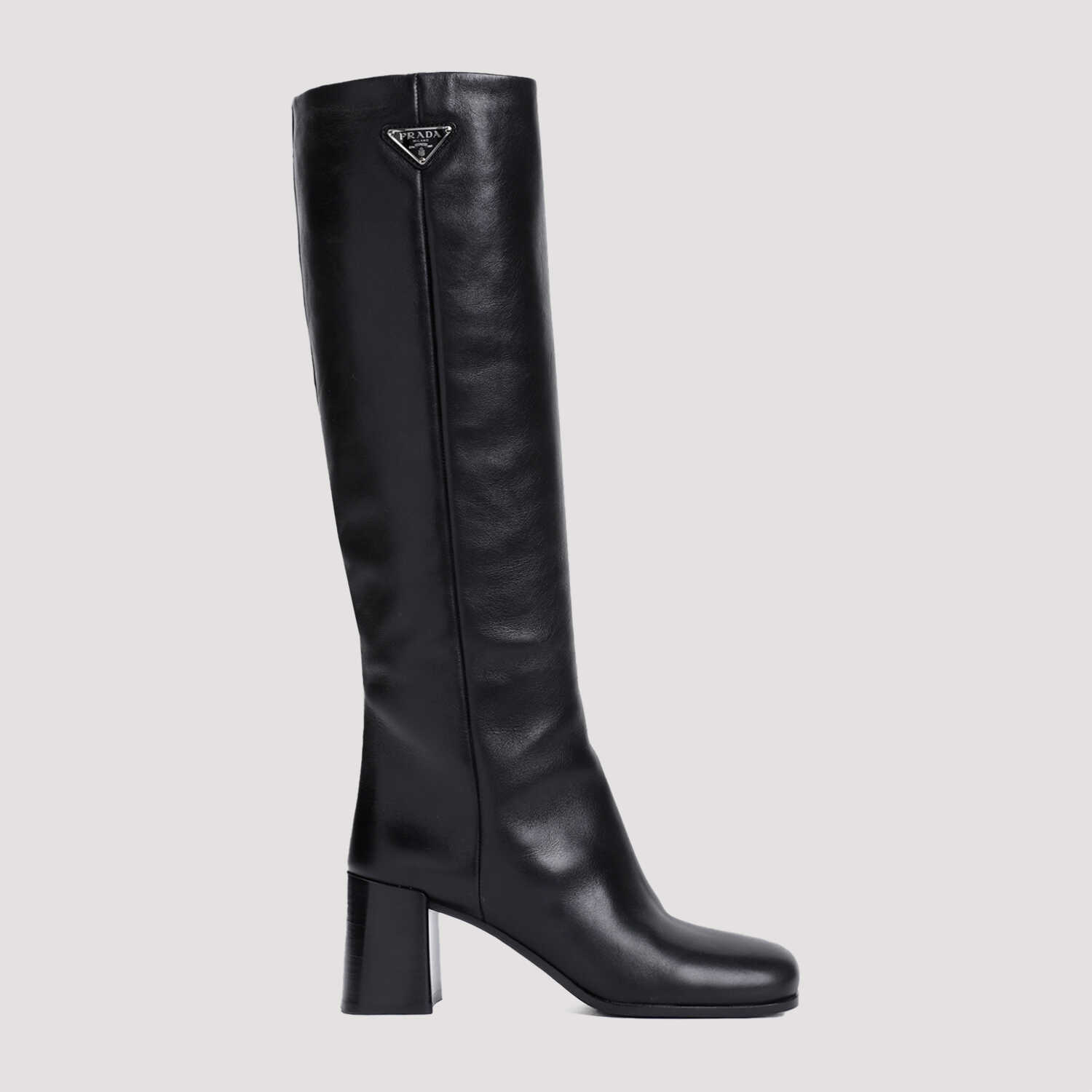 Prada Black Leather Boots. Black leather upper, squared toeline, zip fastening on inner side. Logo signature triangle plaque on side. Regular fit.