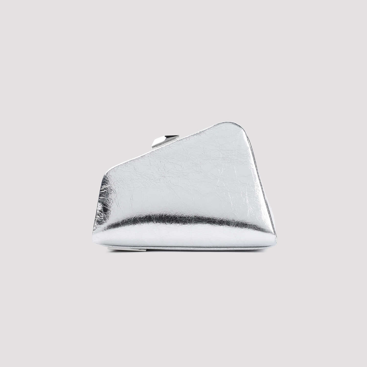 Elevate your style with the luxurious metallic silver lamb leather clutch from ATTICO. Featuring an elegant asymmetric triangle shape, branded hook closure, and detachable shoulder strap. Perfect for carrying your essentials in style. Dimensions: W:18cm H:13.5cm D:9cm. Add a touch of sophistication to your look with this statement piece.