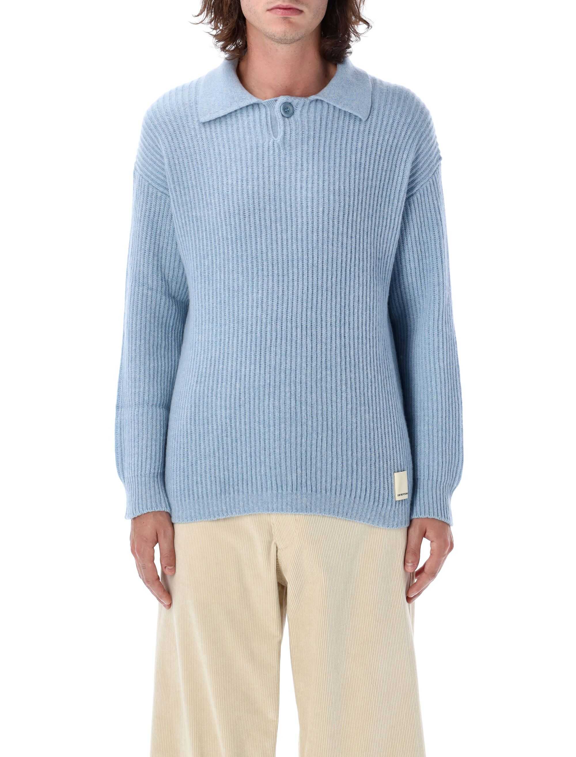 Elevate your wardrobe with this light blue Polo shirt collar sweater by Emporio Armani. Crafted from a luxurious wool blend, it features a refined collar and a modern fit, perfect for layering or wearing alone. Experience comfort and style effortlessly.