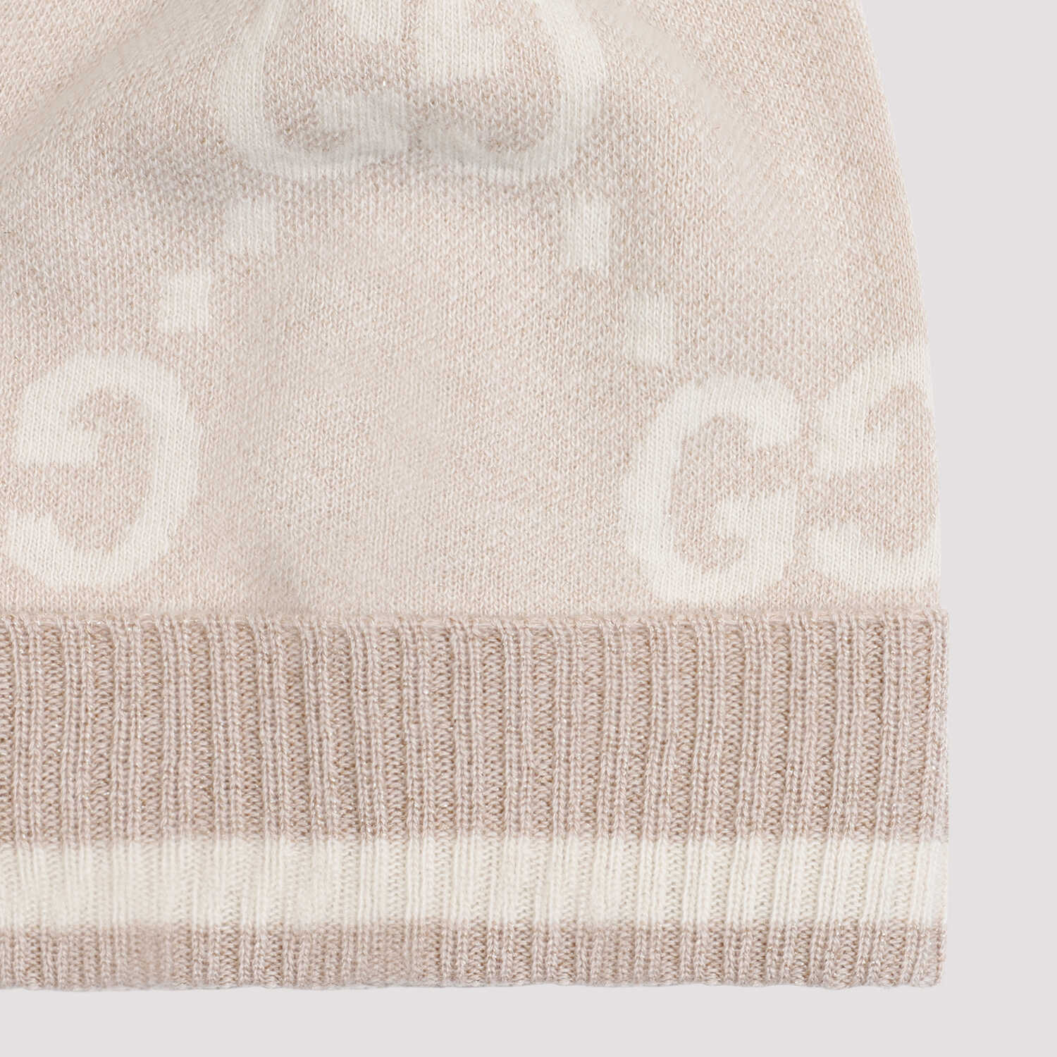Elevate your style with this luxurious Gucci cashmere hat in a chic Nude & Neutrals color scheme. Crafted with 84% cashmere, 9% viscose, and 4% metallized fiber, this hat features a classic GG jacquard design with lurex details and a striped ribbed turn-up hem. Perfect for adding a touch of sophistication to any outfit.