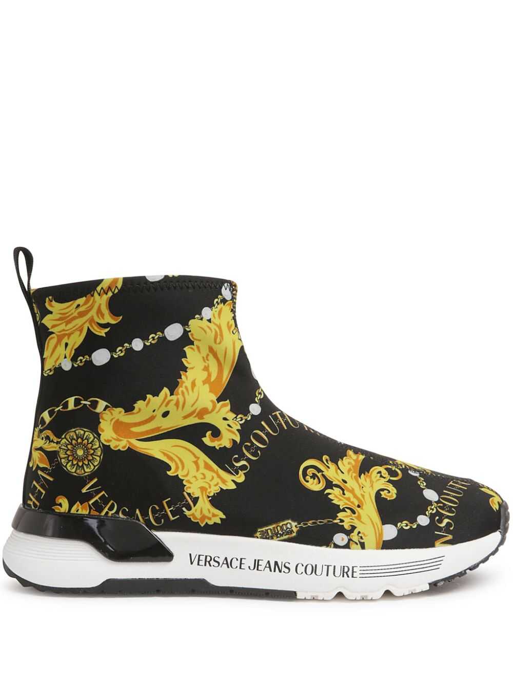 Step into luxury with Versace Jeans Couture Sneakers in classic black. Crafted with premium materials for ultimate comfort, these stylish sneakers elevate any outfit. Perfect for fashion-forward women seeking elegance and versatility in one stunning pair.