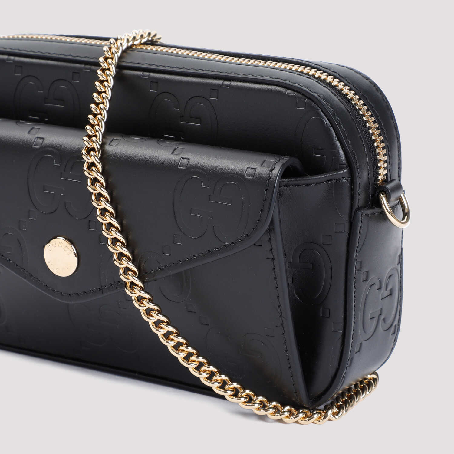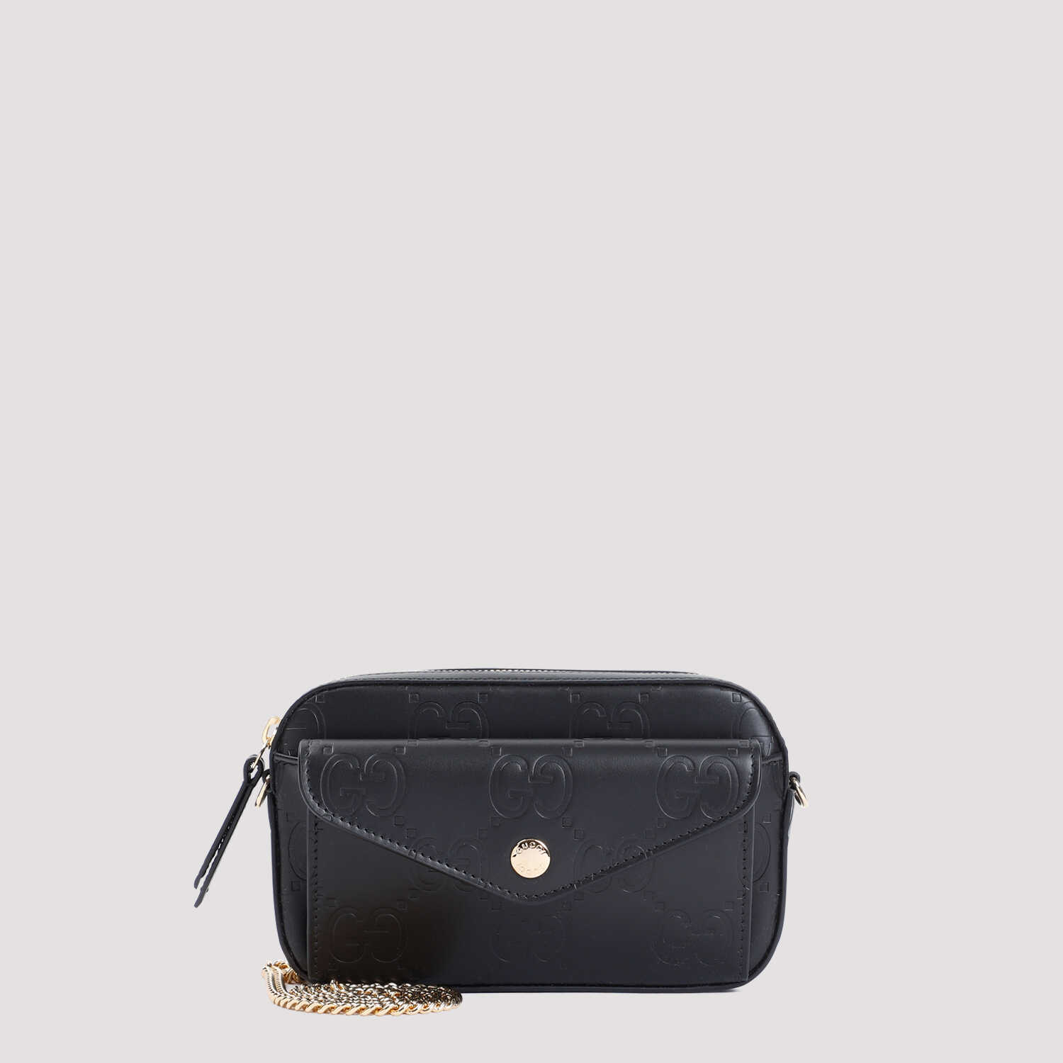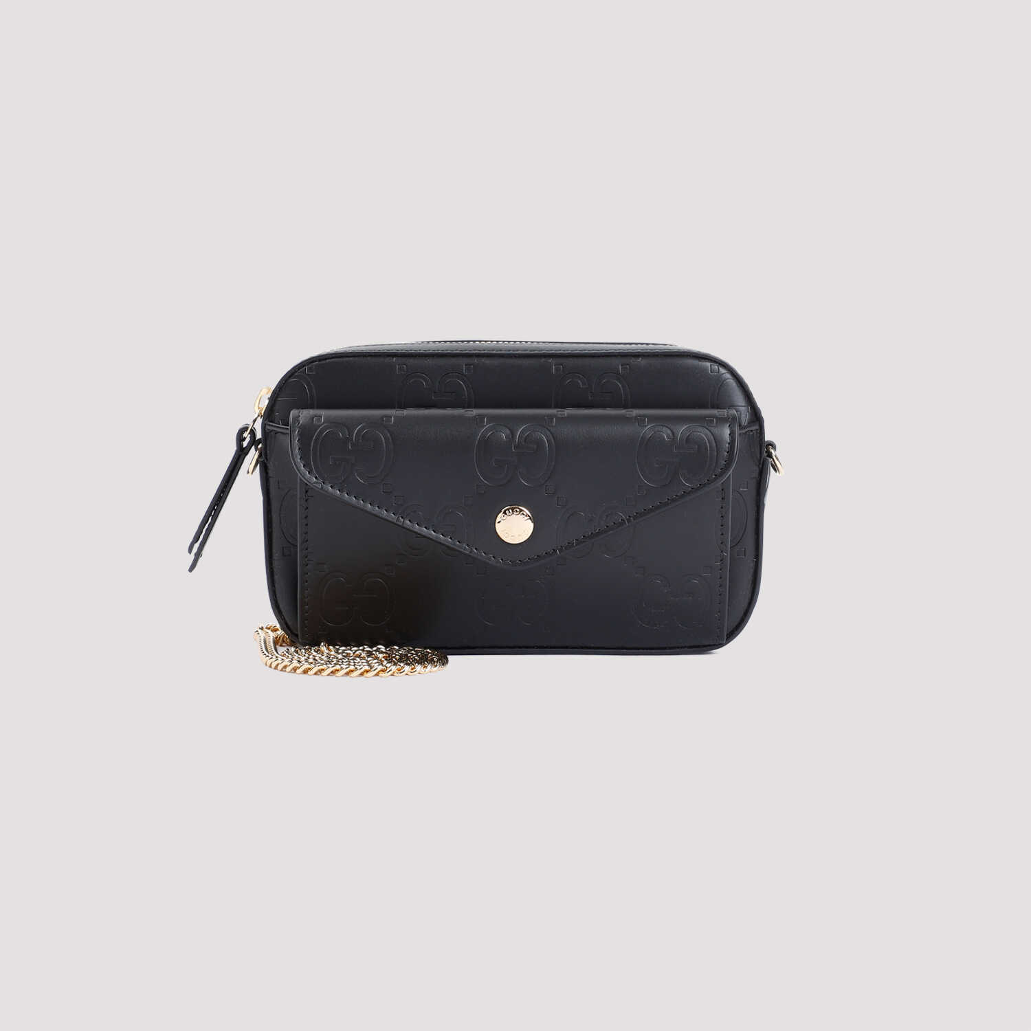 Elevate your style with this stunning Gucci GG black leather mini bag. Crafted from luxurious calf leather, this bag features a sleek design with a front flap pocket, chain shoulder strap, and inner card slots. Perfect for adding a touch of elegance to any outfit.