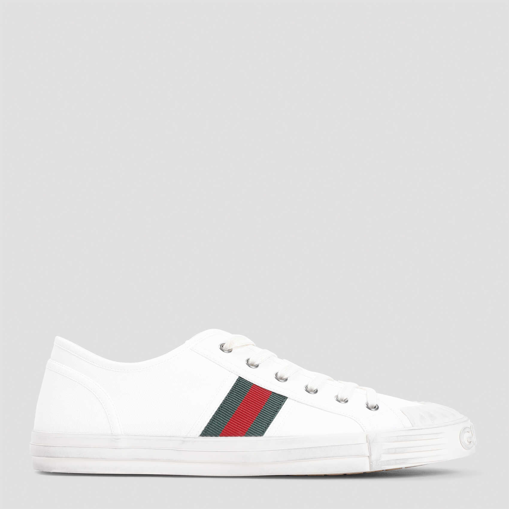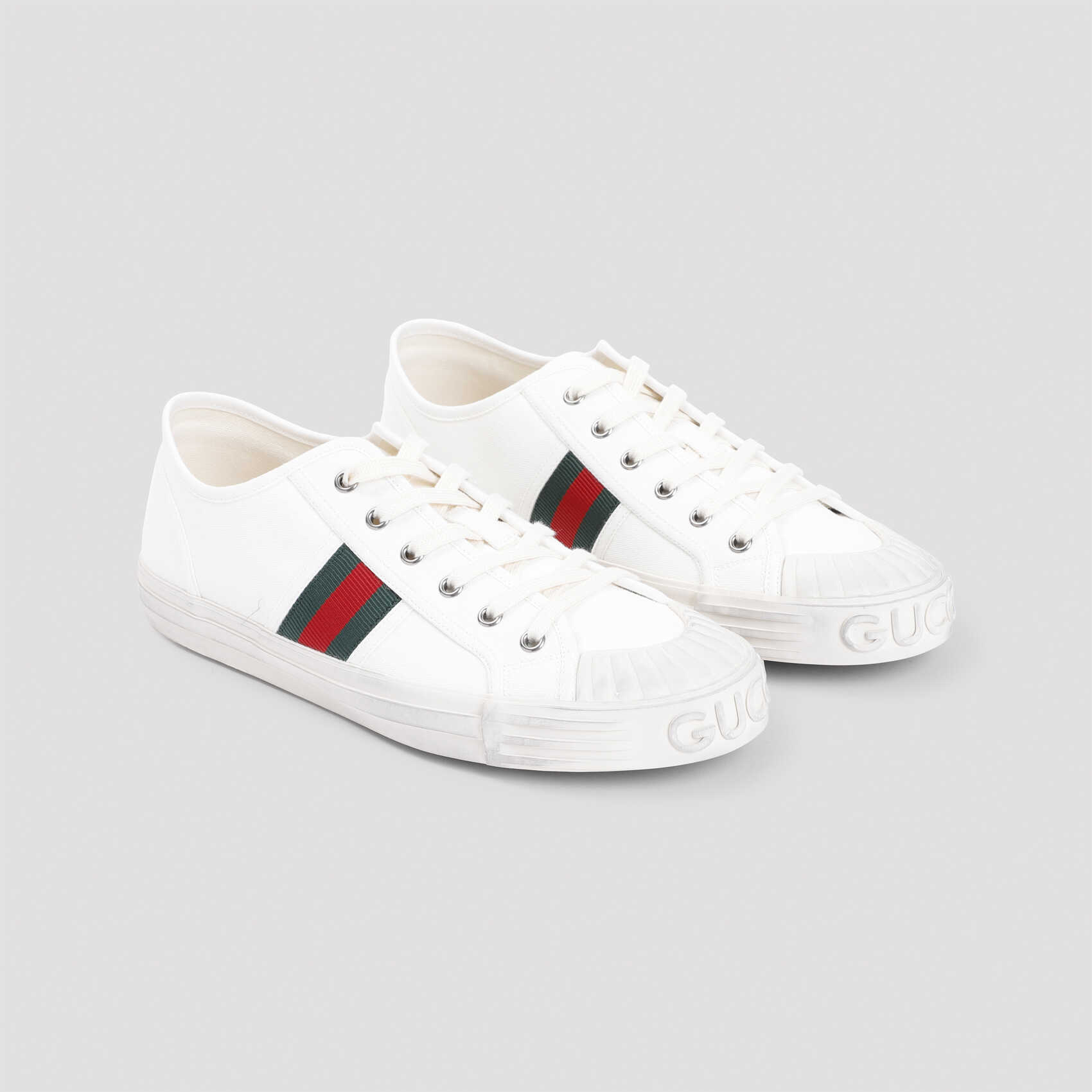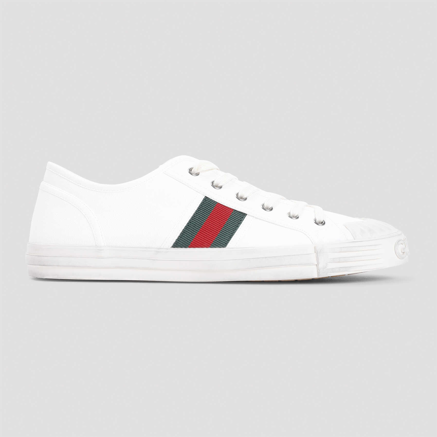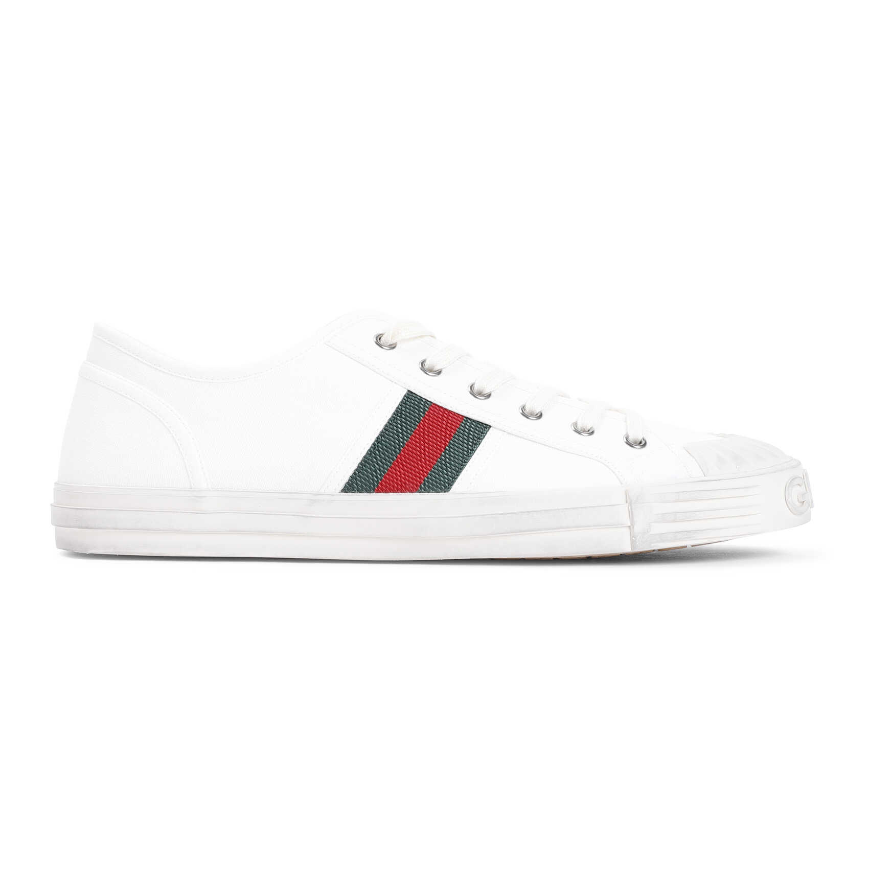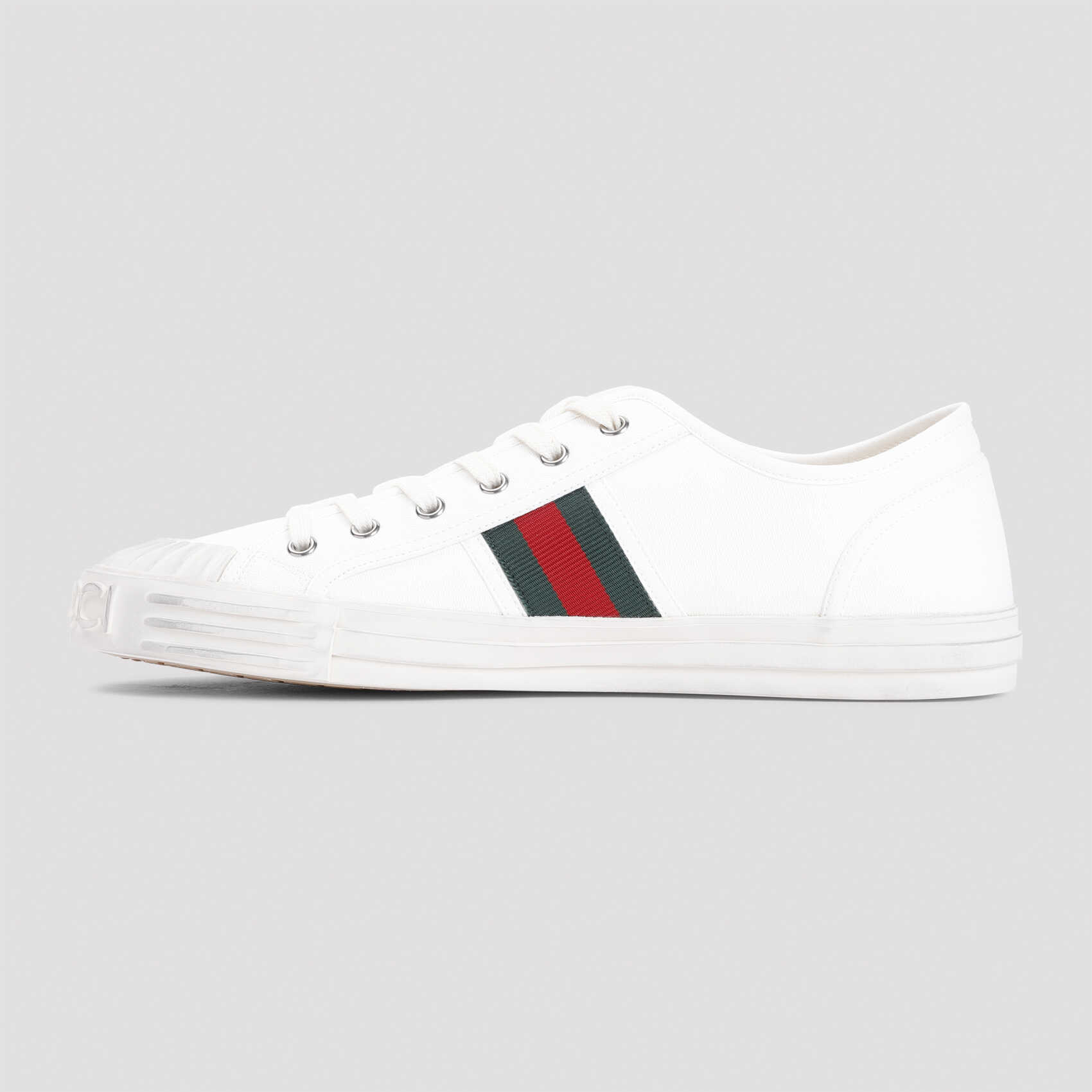 Step out in style with these Gucci Julio white cotton sneakers. Featuring a white cotton canvas upper, round toe with rubber insert, and iconic green and red web strap. The lace-up closure and branded insole add a touch of luxury. Perfect for casual or dressed-up looks, these sneakers are sure to elevate your outfit effortlessly. Don't miss out on this must-have pair!