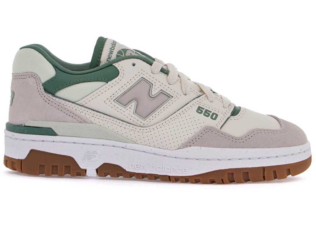 The New Balance 550 sneakers feature a multicolored design with a smooth leather upper decorated with contrasting suede and mesh inserts. They have side perforations, the iconic 'N' inlaid on the sides, a printed 'NB' logo on the back, a '550' print on the side, and a logo label on the tongue. The interior is made of fabric with a removable Ortholite insole, while the rubber sole has an embossed logo on the side and a