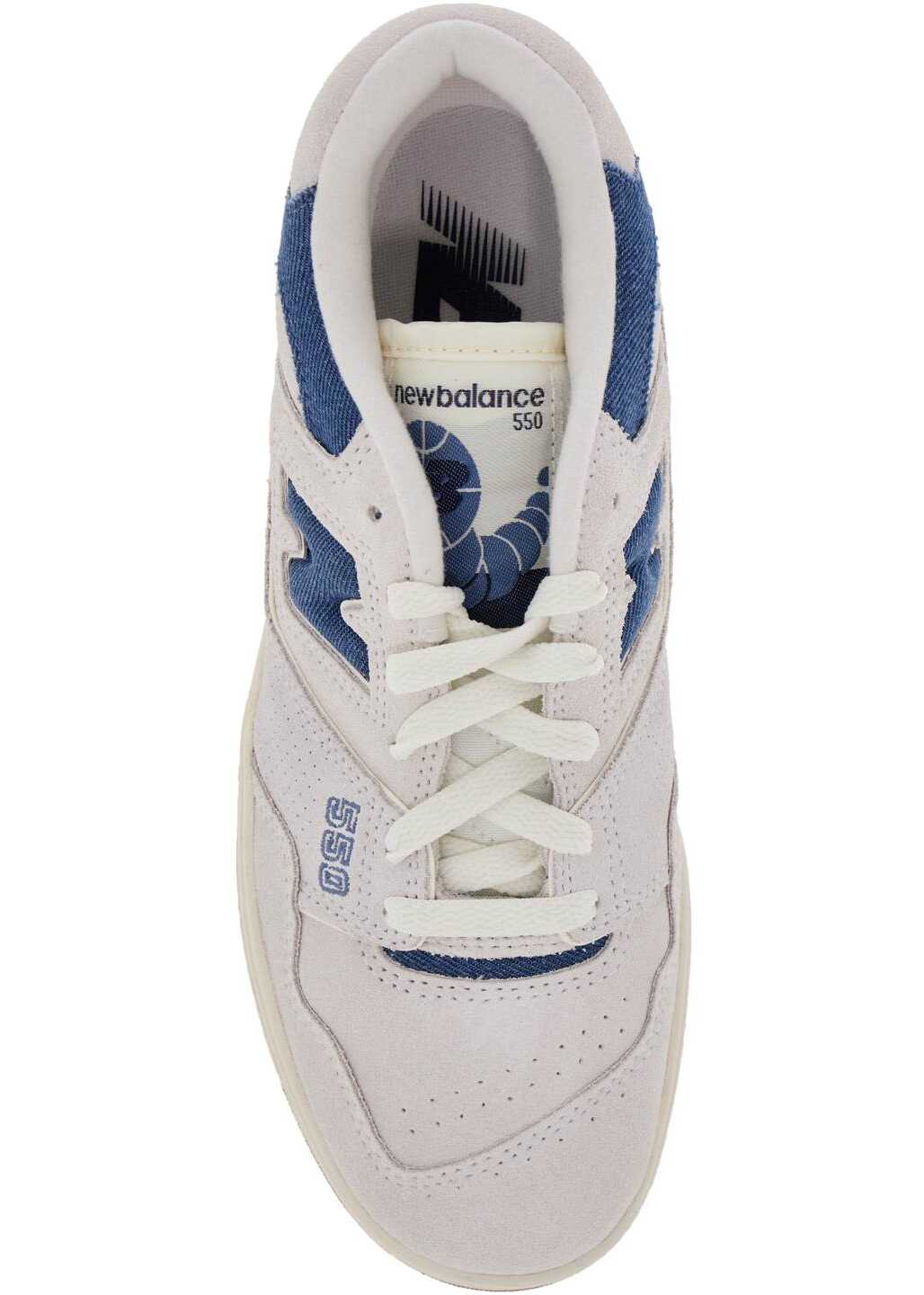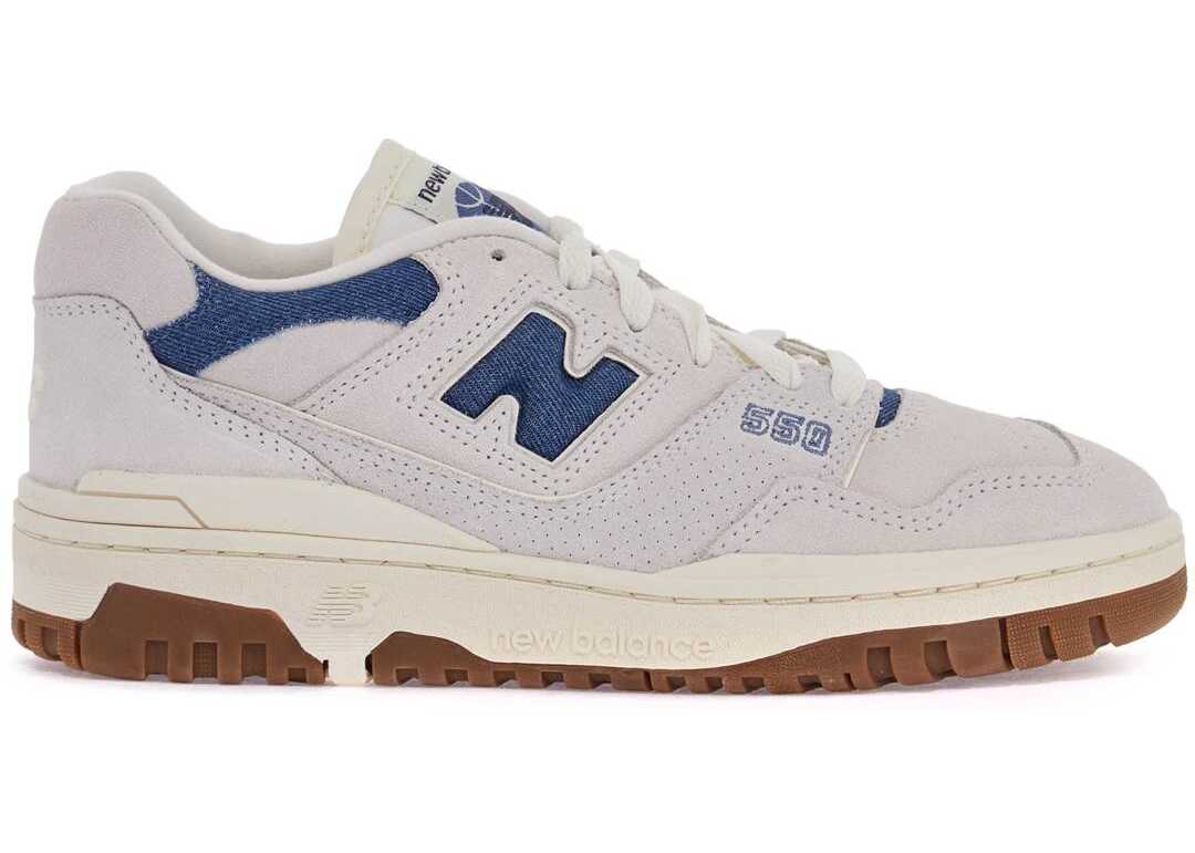 The New Balance 550 sneakers are made of suede leather with contrasting denim effect inserts, side perforations, and the iconic 'N' inlaid on the sides. The 'NB' logo is printed on the back and the number '550' is featured on the side. The padded tongue is made of technical fabric with a fabric logo patch, while the spoiler is made of technical fabric. The interior is lined with fabric and has a removable insole. The rubber sole features an embossed
