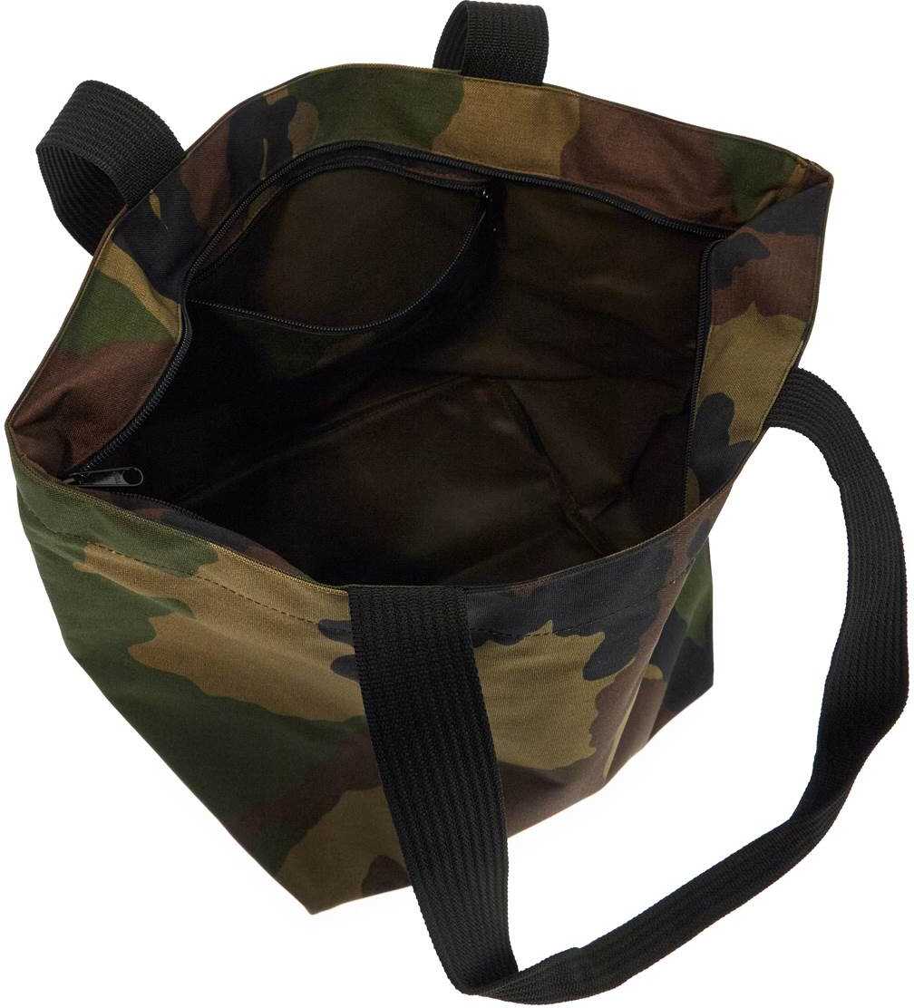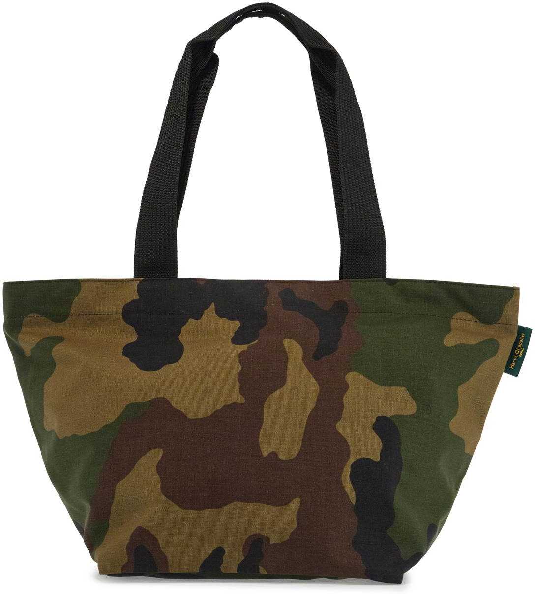 The Hervé Chapelier tote bag is made of camouflage print nylon with a square base, featuring a double zip closure and unlined interior. The handles are made of ribbon for added comfort.