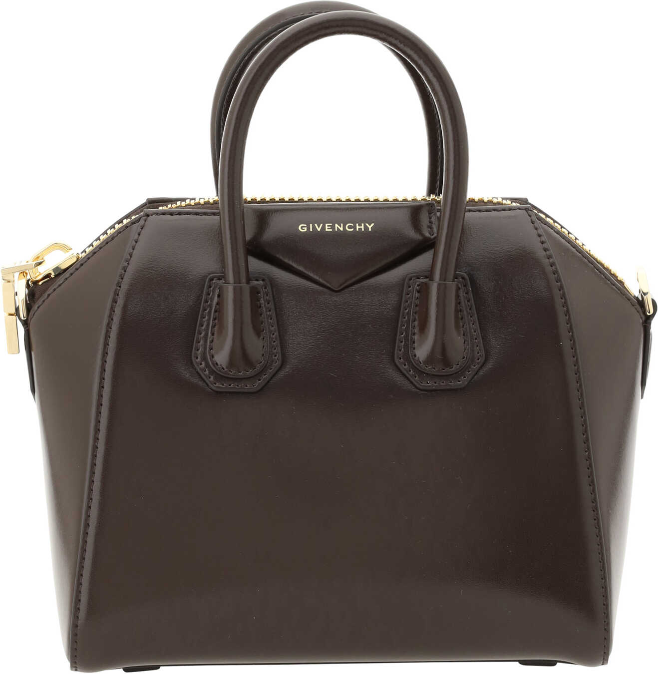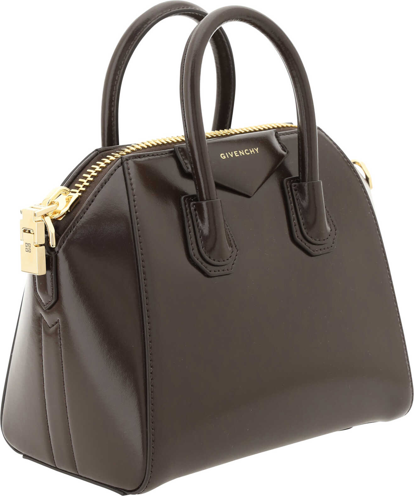 Calfskin Mini Antigona Handbag by Givenchy, shiny leather design, geometric pattern, two rigid top handles, zipper closure on top, contrasting iconic brand monogram on front, adjustable and removable shoulder strap, attached support feet at base of bag.