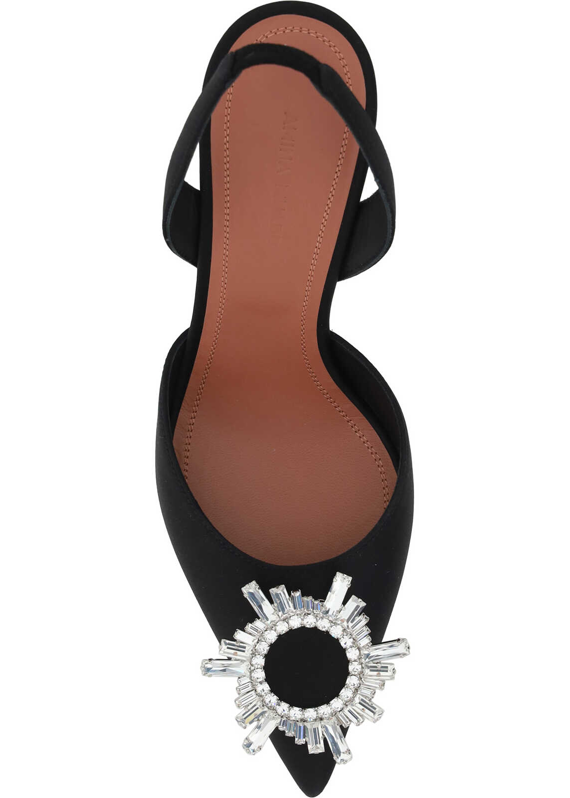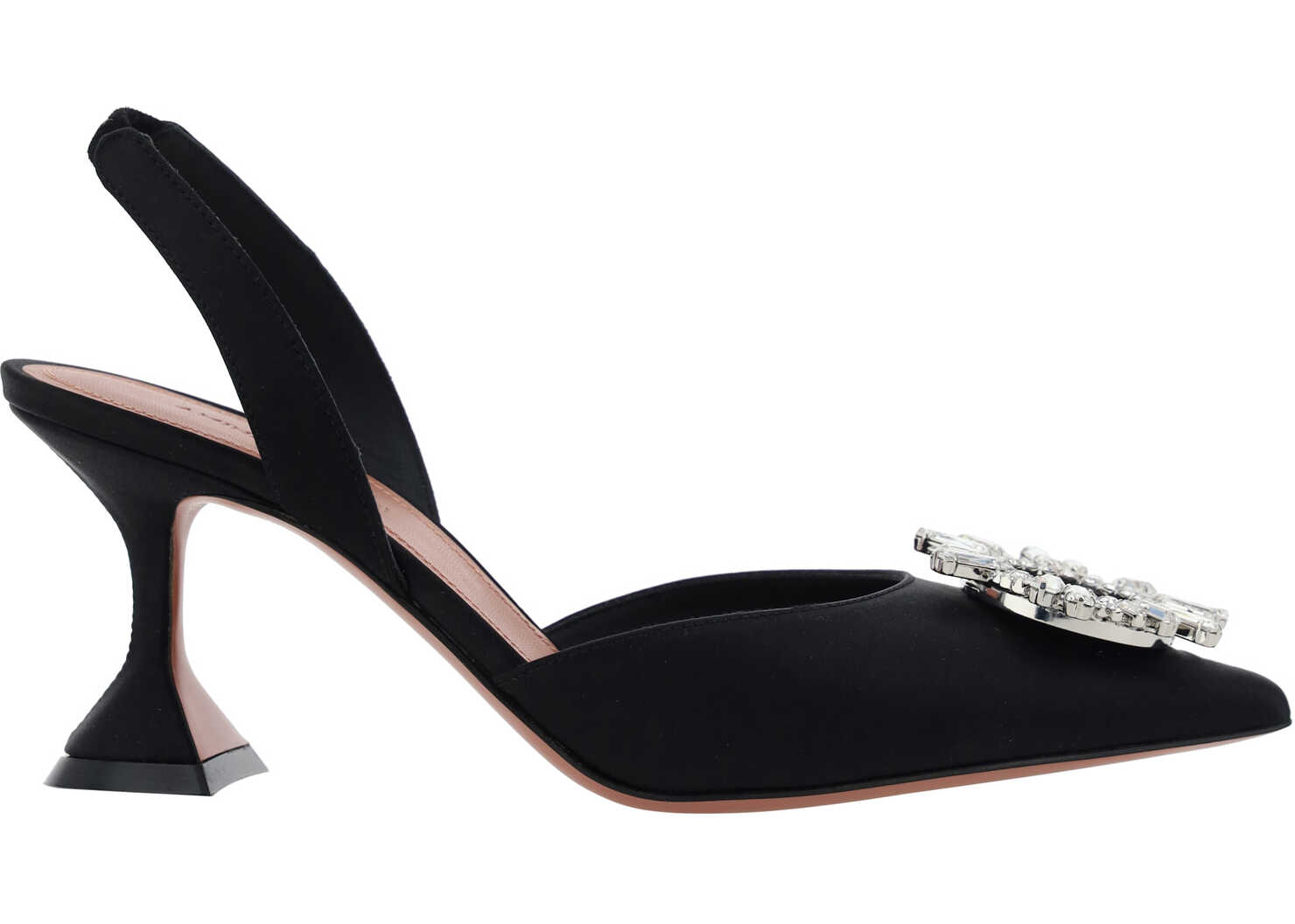 Calfskin Begum Pumps by Amina Muaddi, almond toe front, geometric kitten leather heel, slingback detail at heel, rhinestone and glitter jewel appliqué embossed on toe, logo-embossed insole