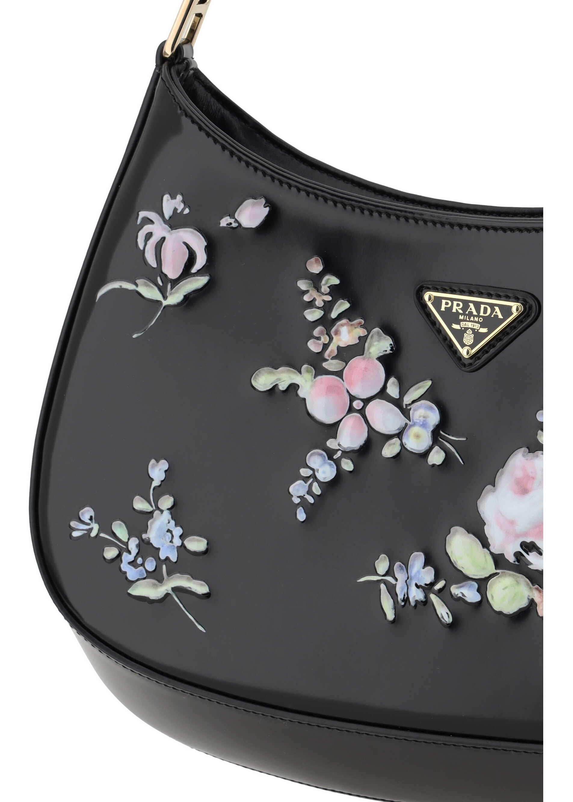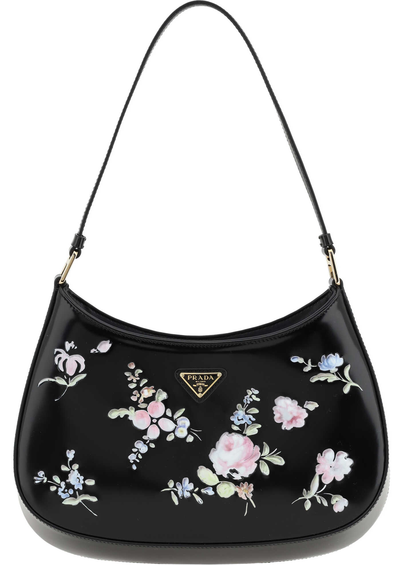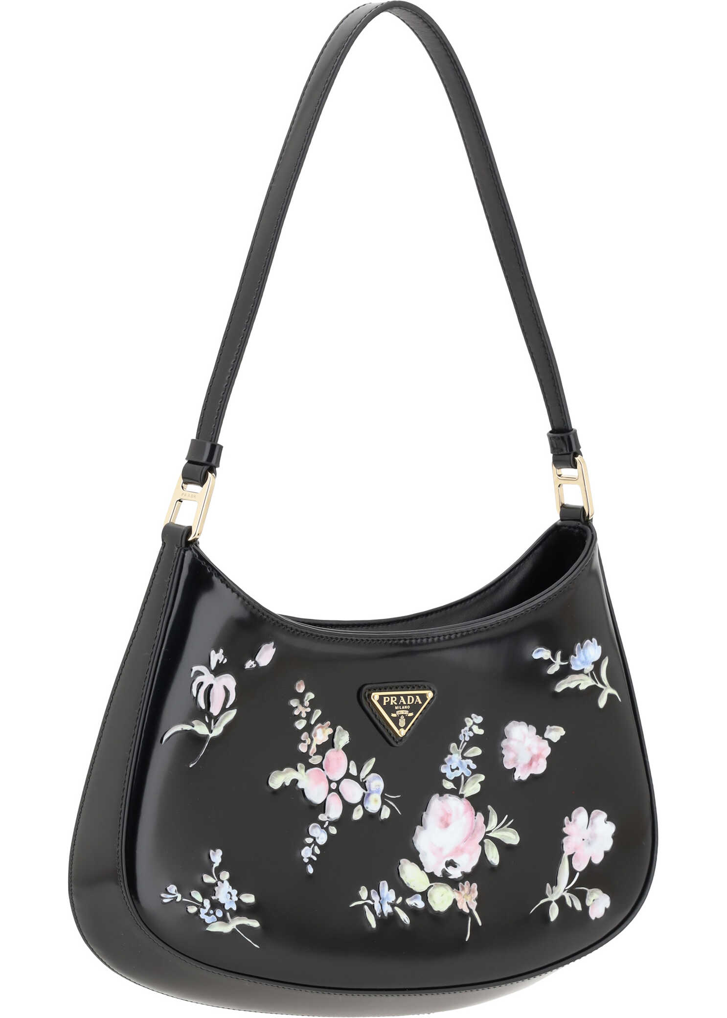 Leather Shoulder Bag by Prada, varnished leather design, flat top handle, magnetic button closure at top, iconic enameled triangular brand signature plaque applied to front, single interior compartment, multicolored embossed flowers on front panel.