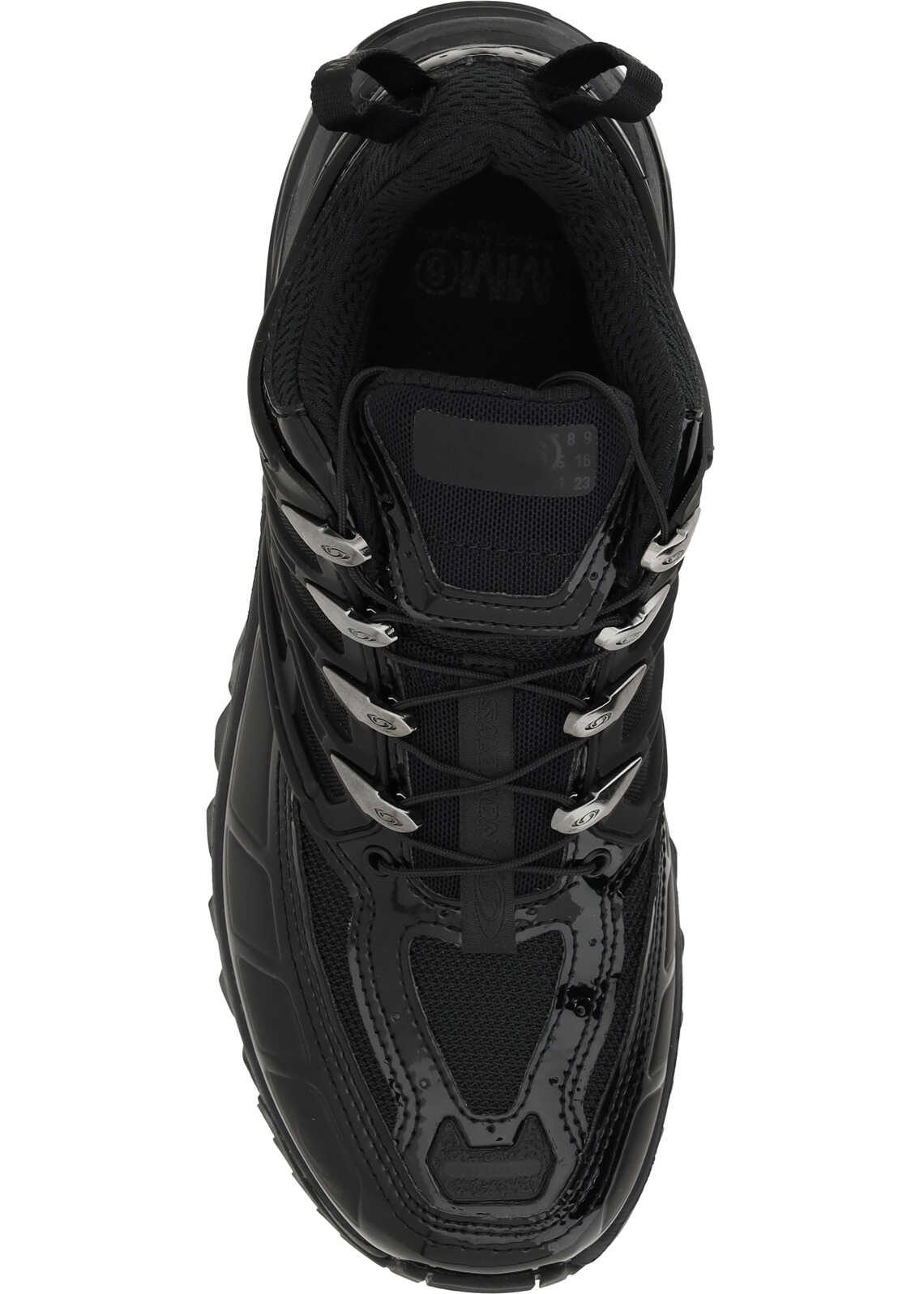 Sneakers by MM6 X Salomon, paneled design, front closure via elasticated drawstring, nylon heel pull for easy fit, elongated toe on front, iconic Salomon monogram printed on side panel, iconic contrasting MM6 logo on front tab, contrasting metal eyeglasses.