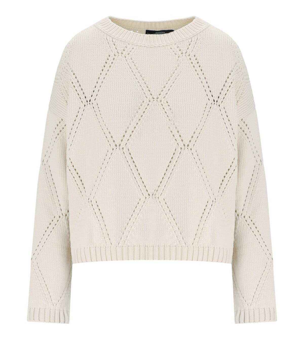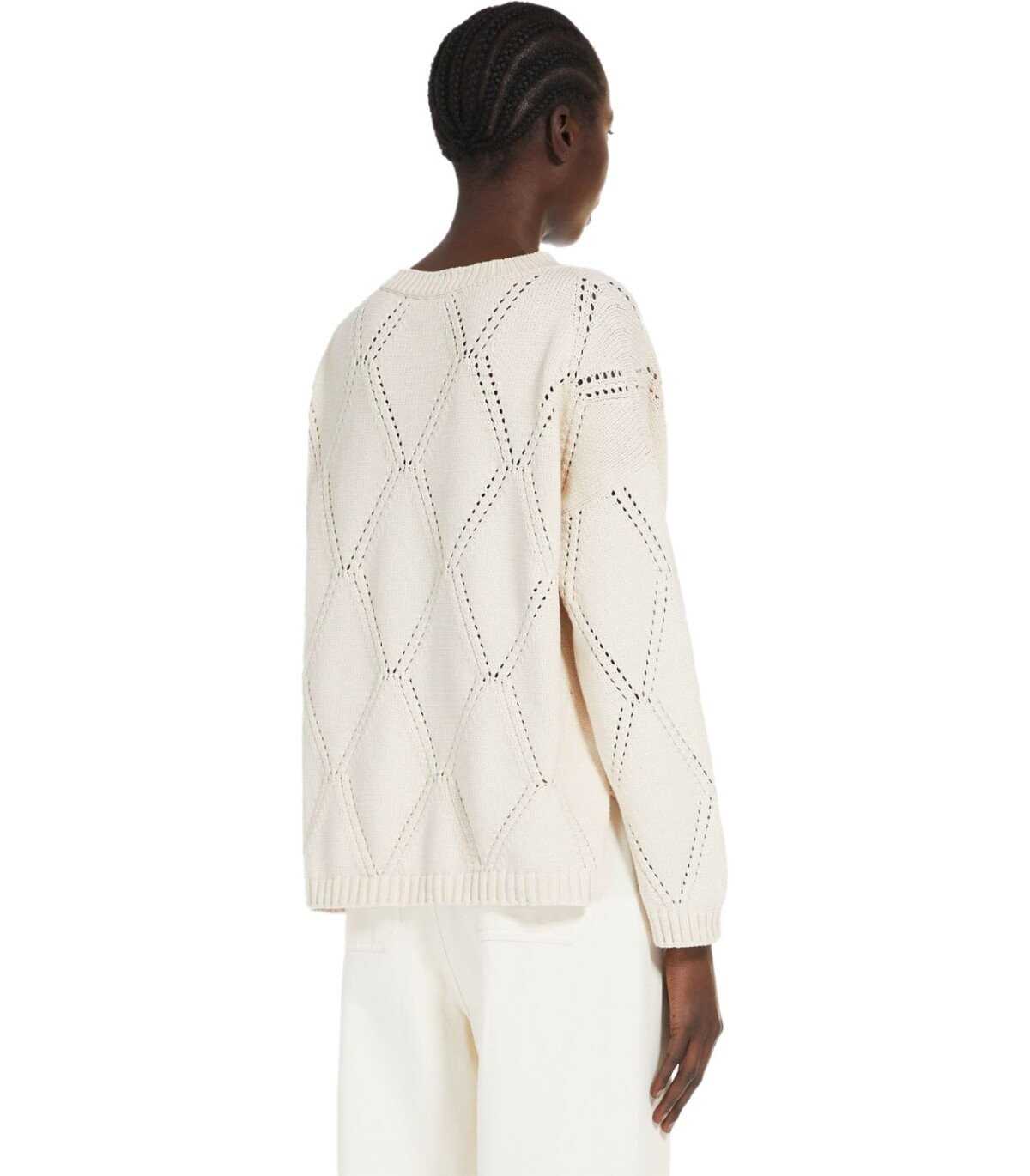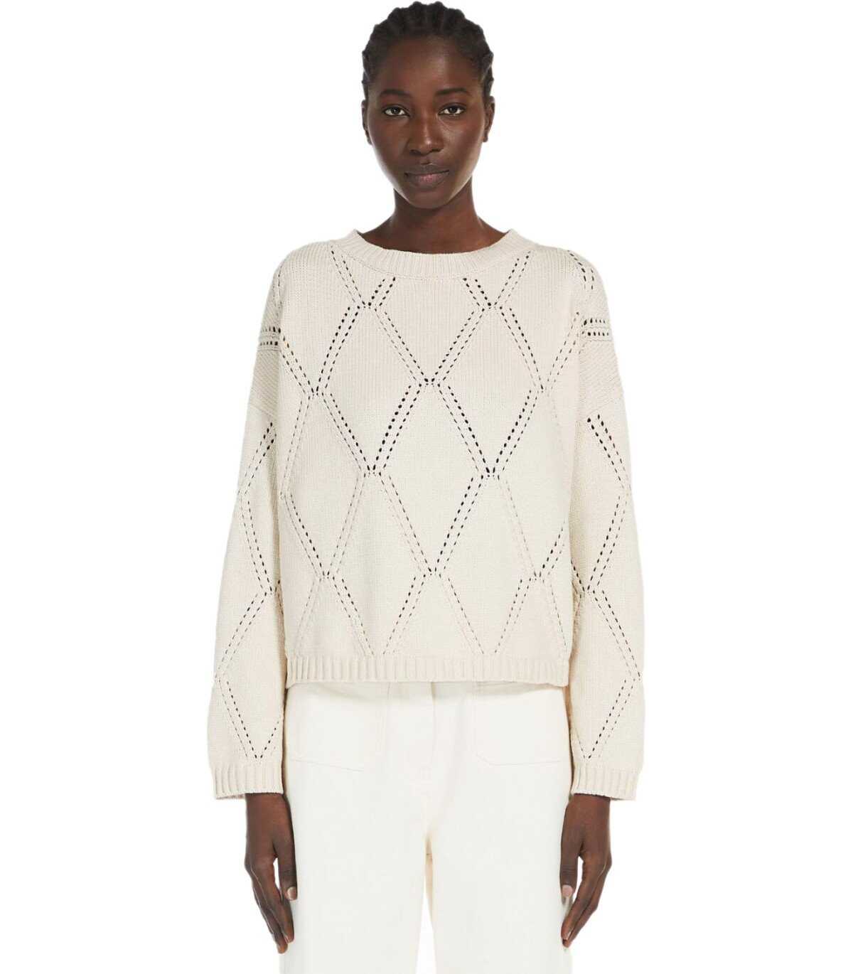 Abbozzi crewneck jumper by Max Mara Weekend made of cotton yarn in the ecru color shade. Characterized by a diamond-shaped punched pattern, it features long raglan sleeves with a low round finish and ribbed edges. Asymmetrical hem longer at the back with side slits. Oversized fit.